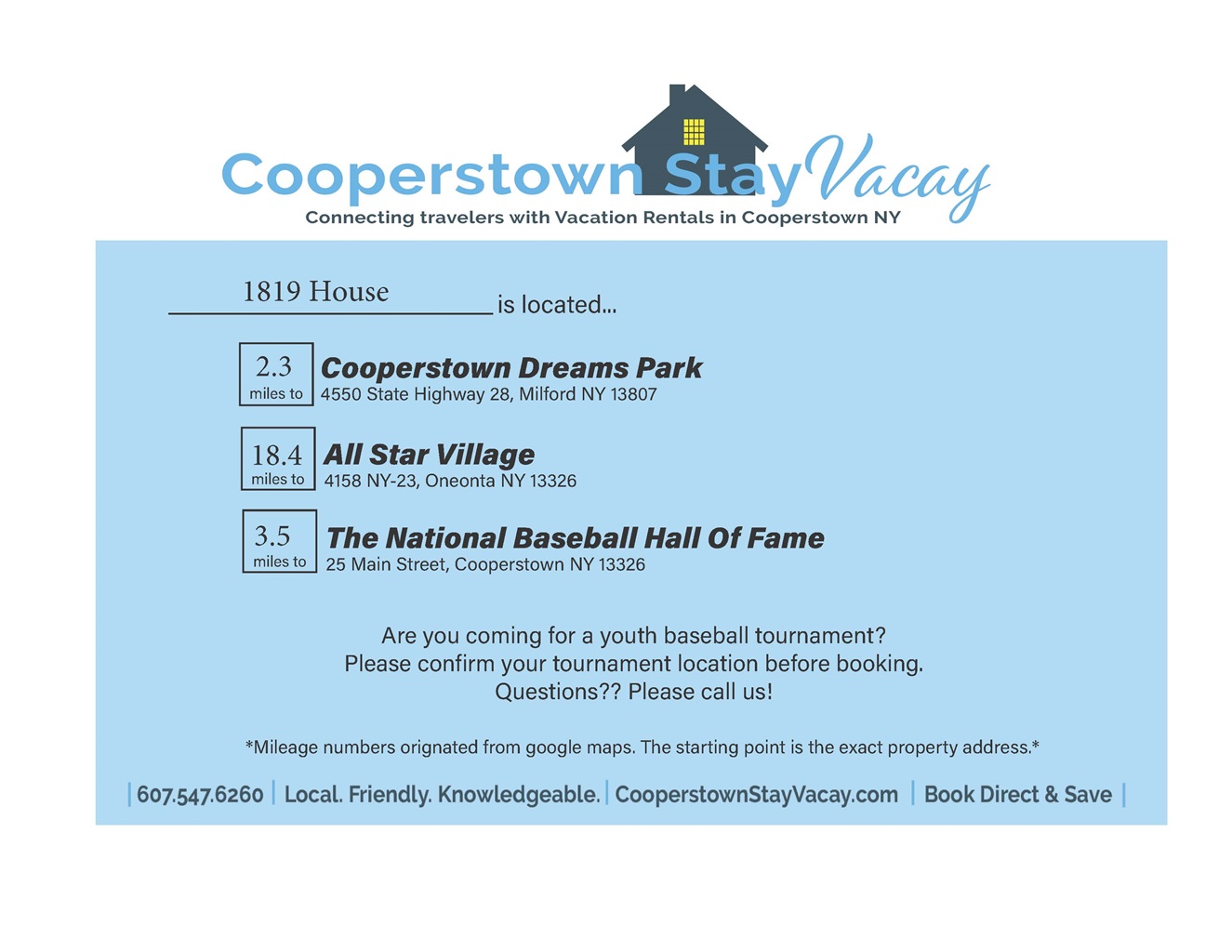 1819 House - is an ideal choice for your team! It is less than a 5 minute drive to the Cooperstown Dreams Park. Yes, you are welcome to have a well supervised team party. Teams often hire local caterers for their team parties here. The expansive grounds provide lots of room for outside fun and games.