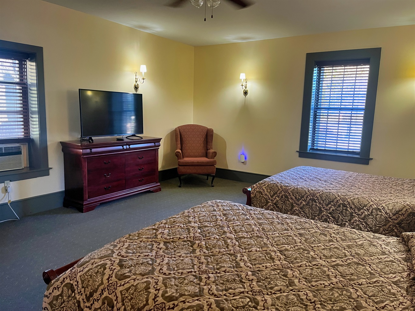 The 1819 House is unique. The main level of the 1819 House includes six bedrooms that are furnished and decorated with taste and distinction. Each bedroom is equivalent to a private hotel room with a private bath and private entry from one of the covered porches. Three bedrooms each have a queen bed and three bedrooms each have two queen beds.