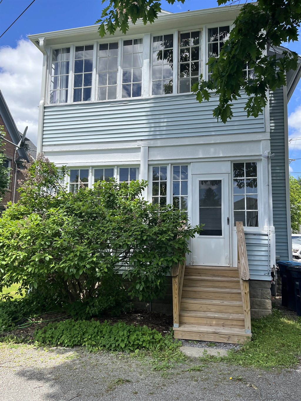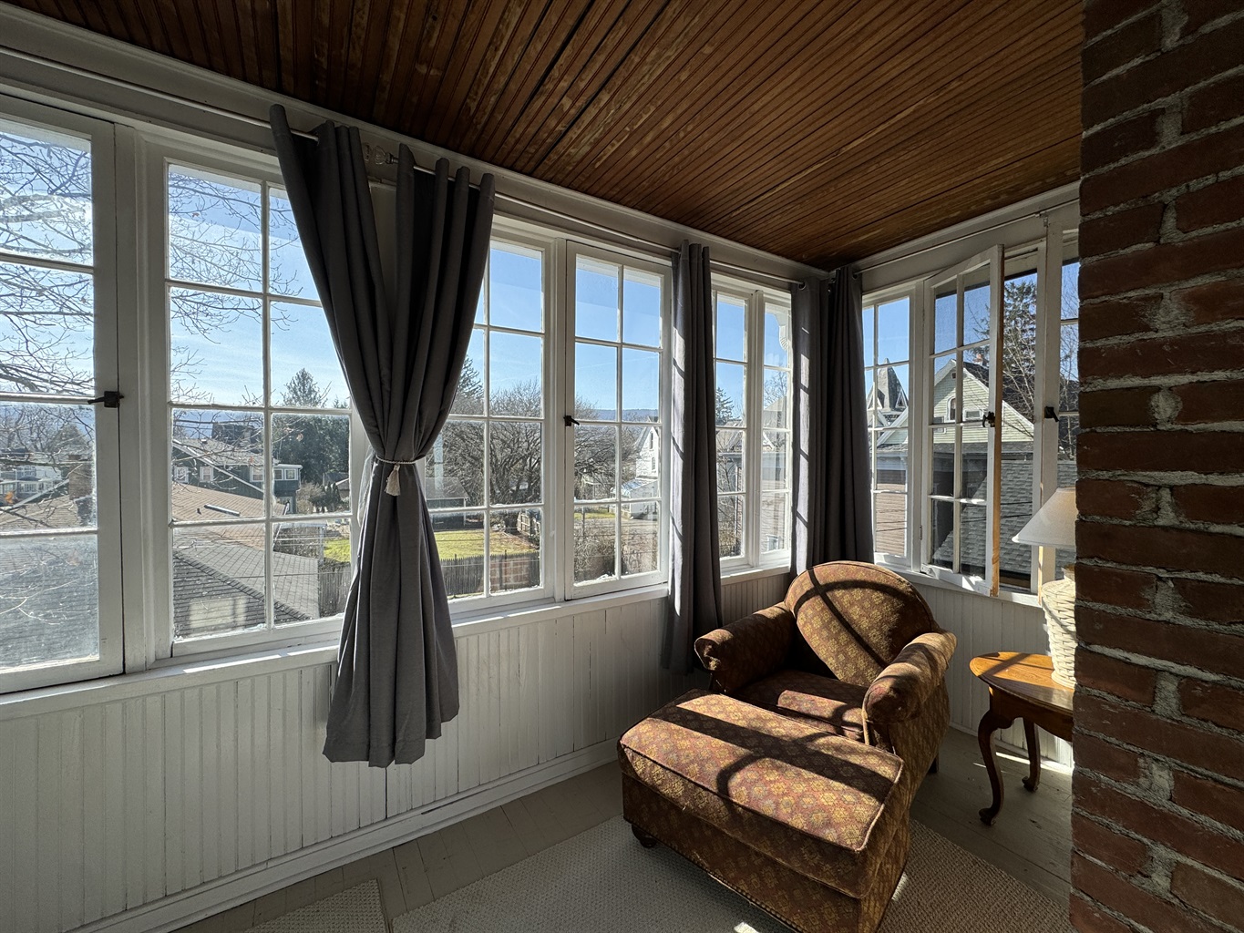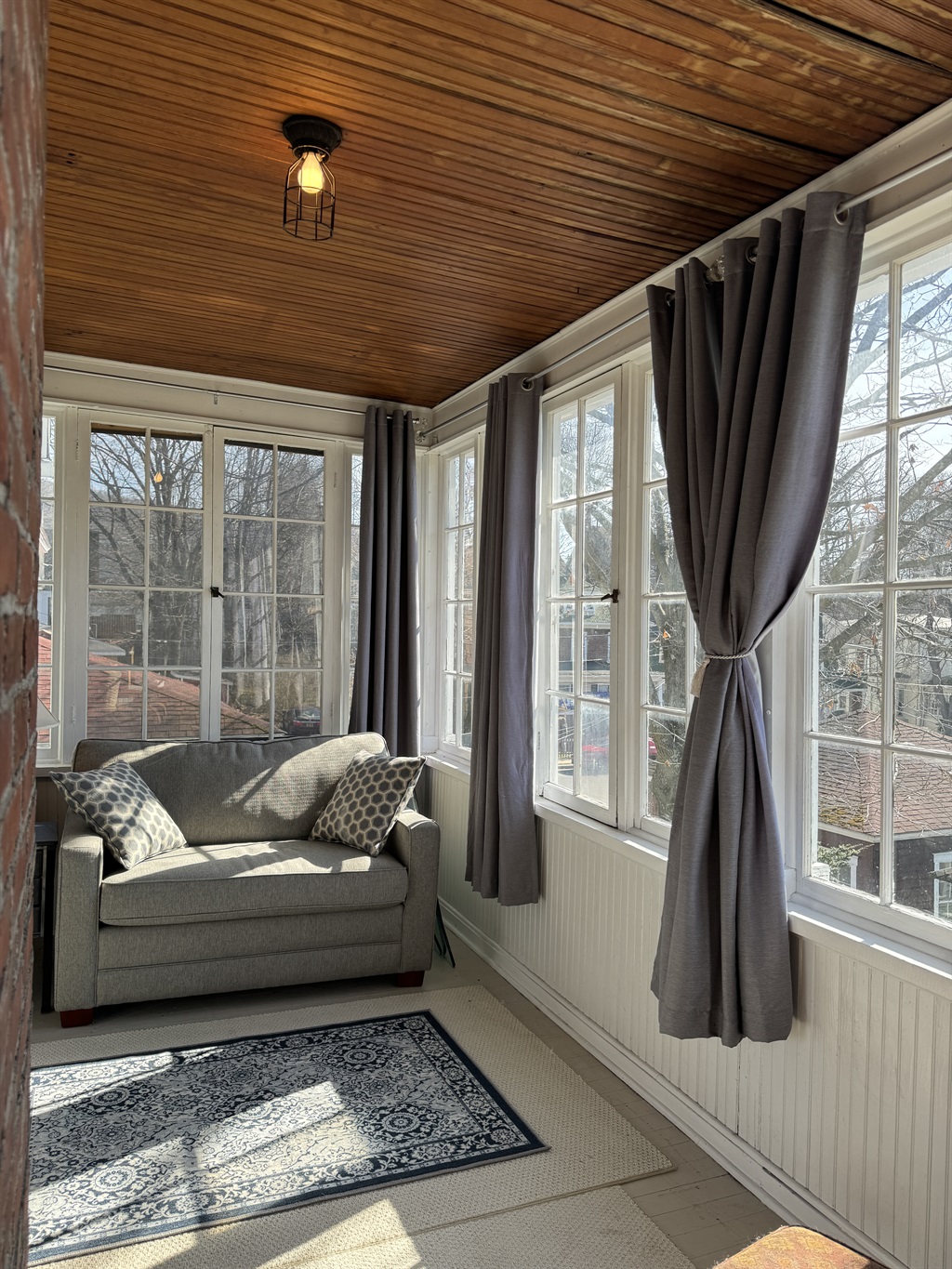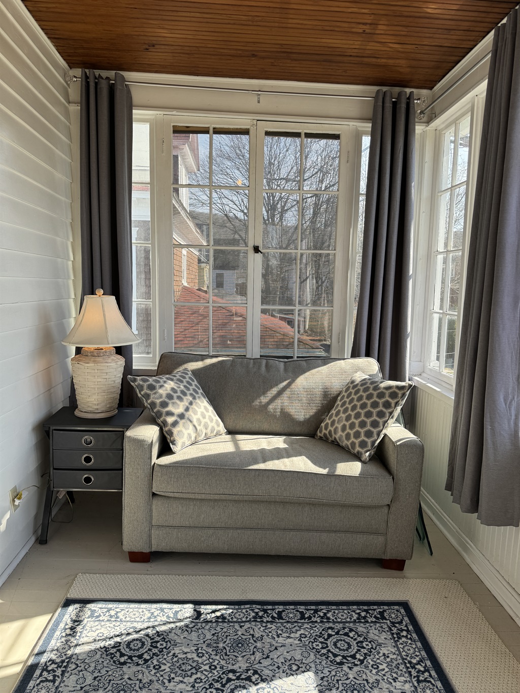 This quaint apartment is just what a small group needs for convenience while in town. There are 2 bedrooms each with a Queen bed, and ROKU TV. Plenty of natural light fills the rooms through the large windows. The center hall has a convenient laundry nook with a stackable washer/dryer as well as a full bathroom with tub/shower, which is just steps from each bedroom. A large living room is in the front of the apartment overlooking Main Street. For those of you who have to put in some hours working between baseball games, there is a desk in the dining room, perfect for all your WFH needs. A very functional layout between the kitchen and dining room will allow for easily getting meals on the table. The kitchen has everything you'll need for a short stay in town, except groceries, of course. There are a handful of grocery stores all within 5 min or less and tons of restaurants if you want to skip cooking while on vacation. Of course, we save the best for last, the sun porch! This terrific room is at the back of the apartment and looks out over the neighboring backyards. Giant windows allow beautiful sunlight to fill the room.
