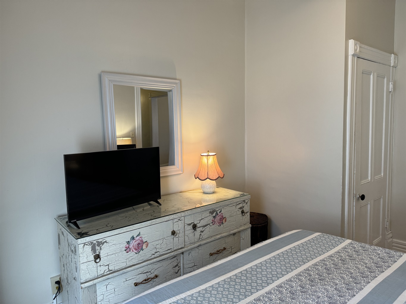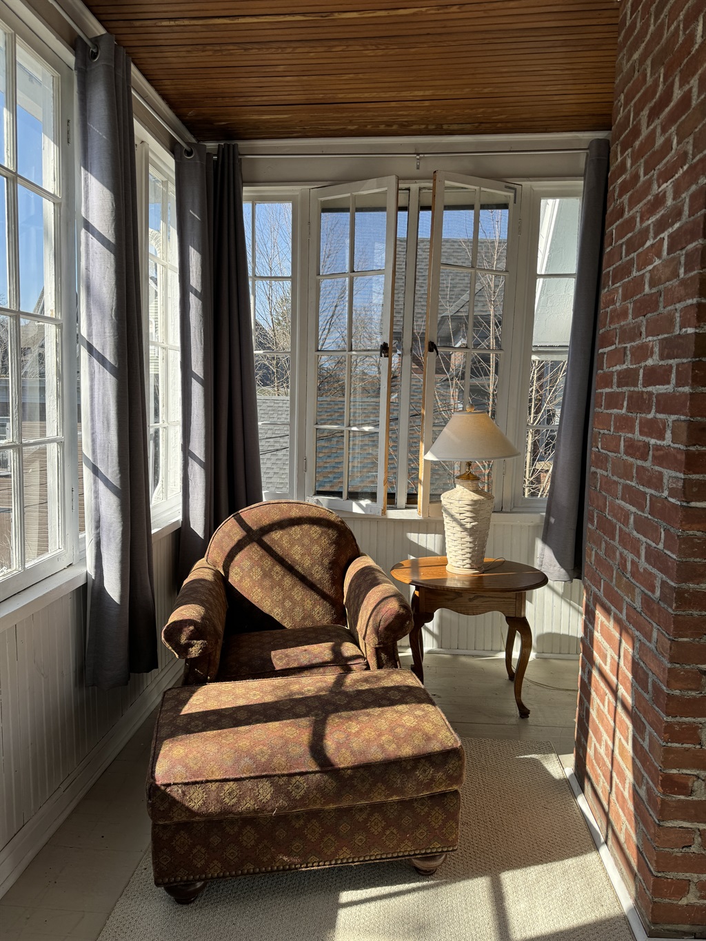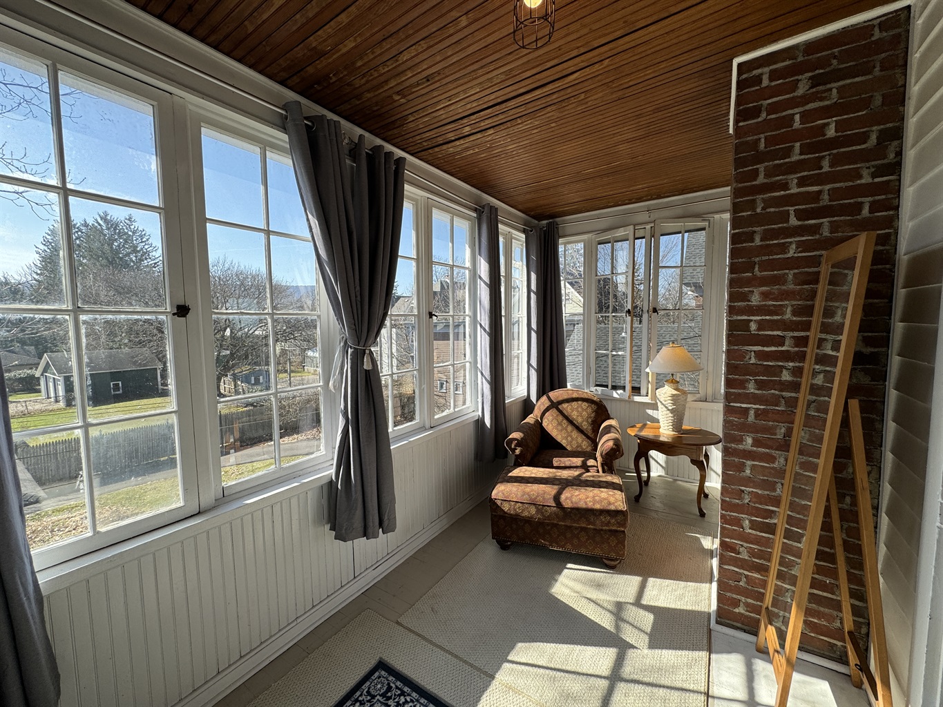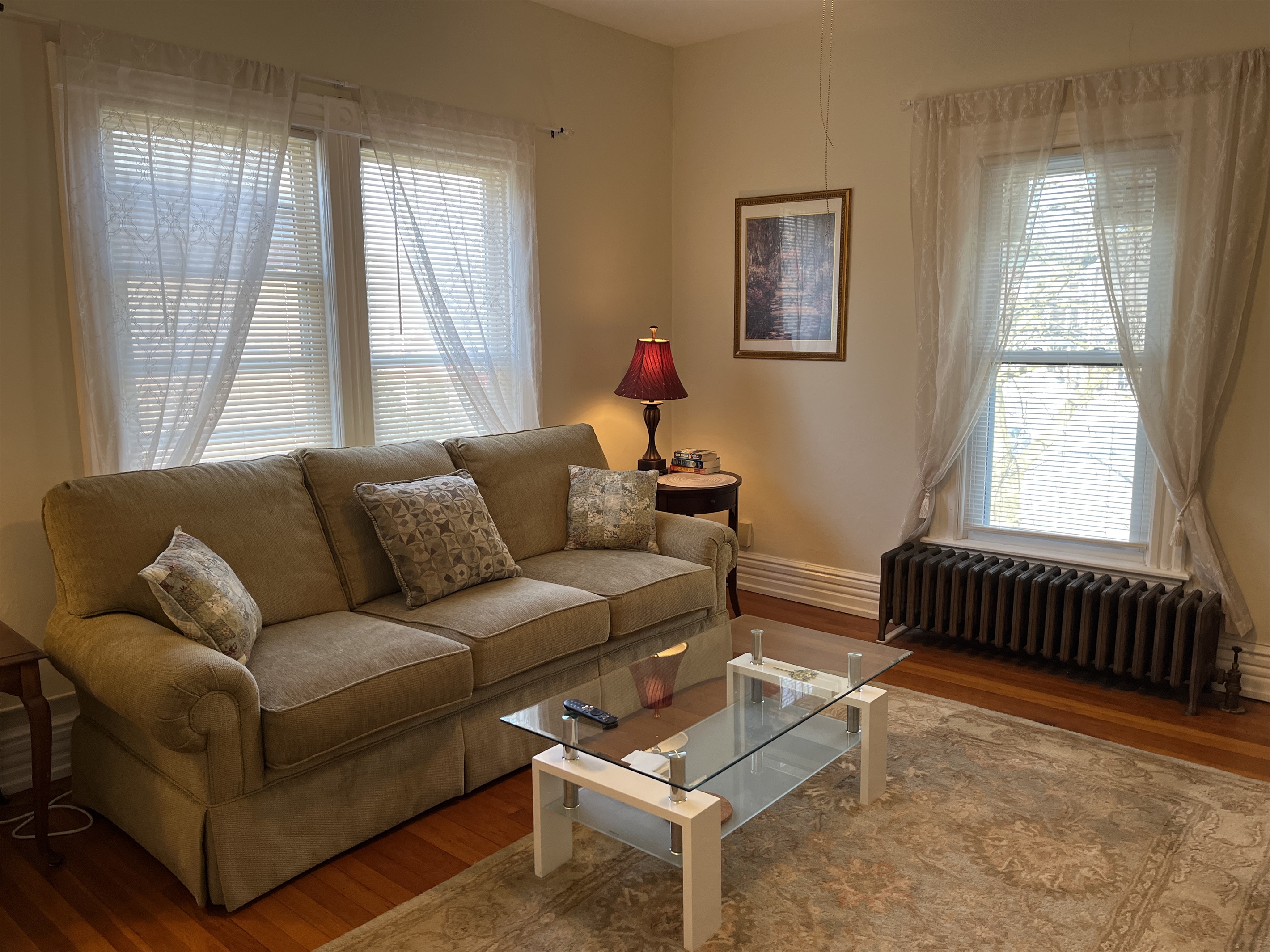 This quaint apartment is just what a small group needs for convenience while in town. There are 2 bedrooms each with a Queen bed, and ROKU TV. Plenty of natural light fills the rooms through the large windows. The center hall has a convenient laundry nook with a stackable washer/dryer as well as a full bathroom with tub/shower, which is just steps from each bedroom. A large living room is in the front of the apartment overlooking Main Street. For those of you who have to put in some hours working between baseball games, there is a desk in the dining room, perfect for all your WFH needs. A very functional layout between the kitchen and dining room will allow for easily getting meals on the table. The kitchen has everything you'll need for a short stay in town, except groceries, of course. There are a handful of grocery stores all within 5 min or less and tons of restaurants if you want to skip cooking while on vacation. Of course, we save the best for last, the sun porch! This terrific room is at the back of the apartment and looks out over the neighboring backyards. Giant windows allow beautiful sunlight to fill the room.