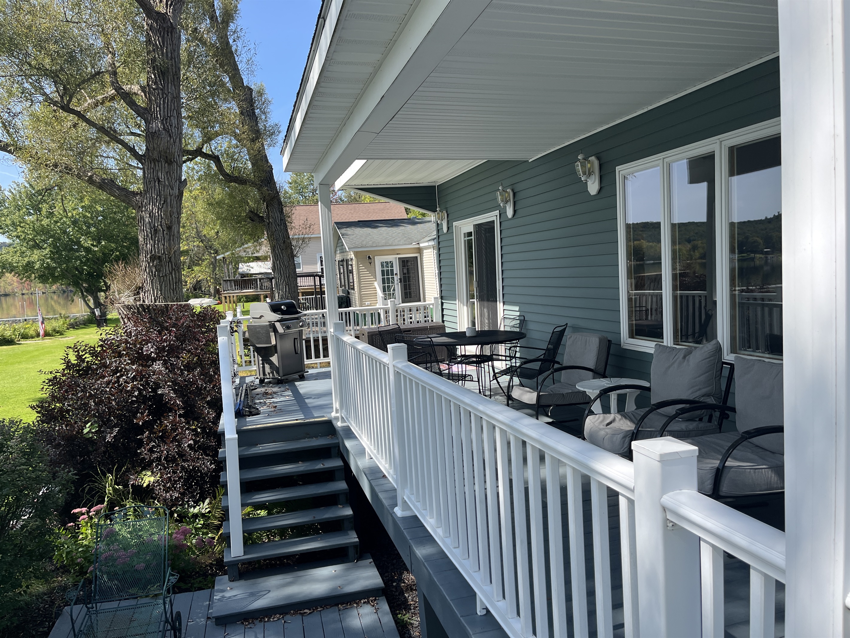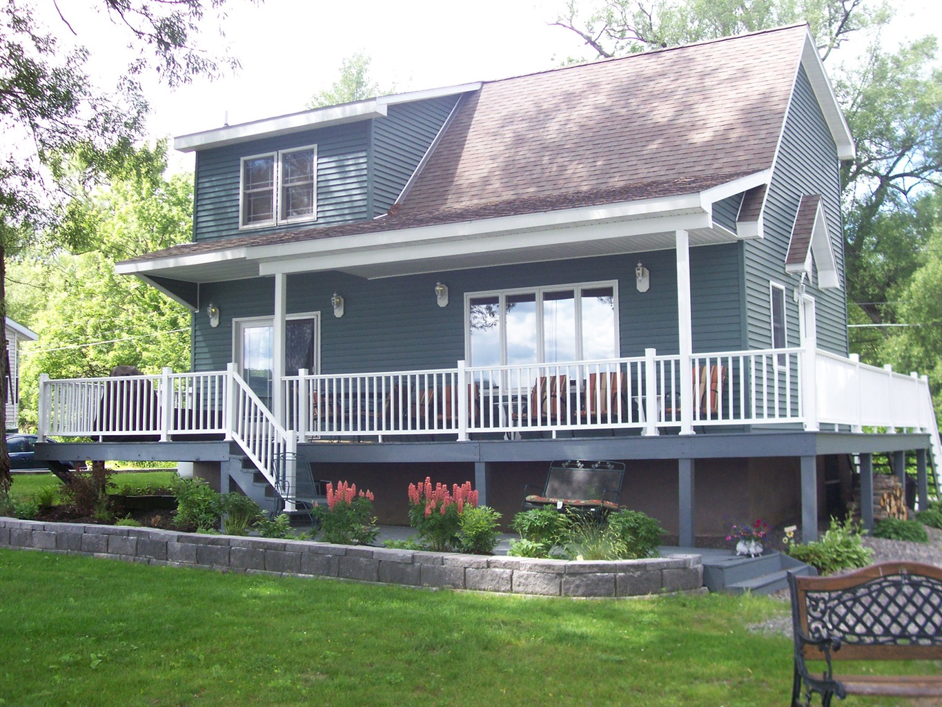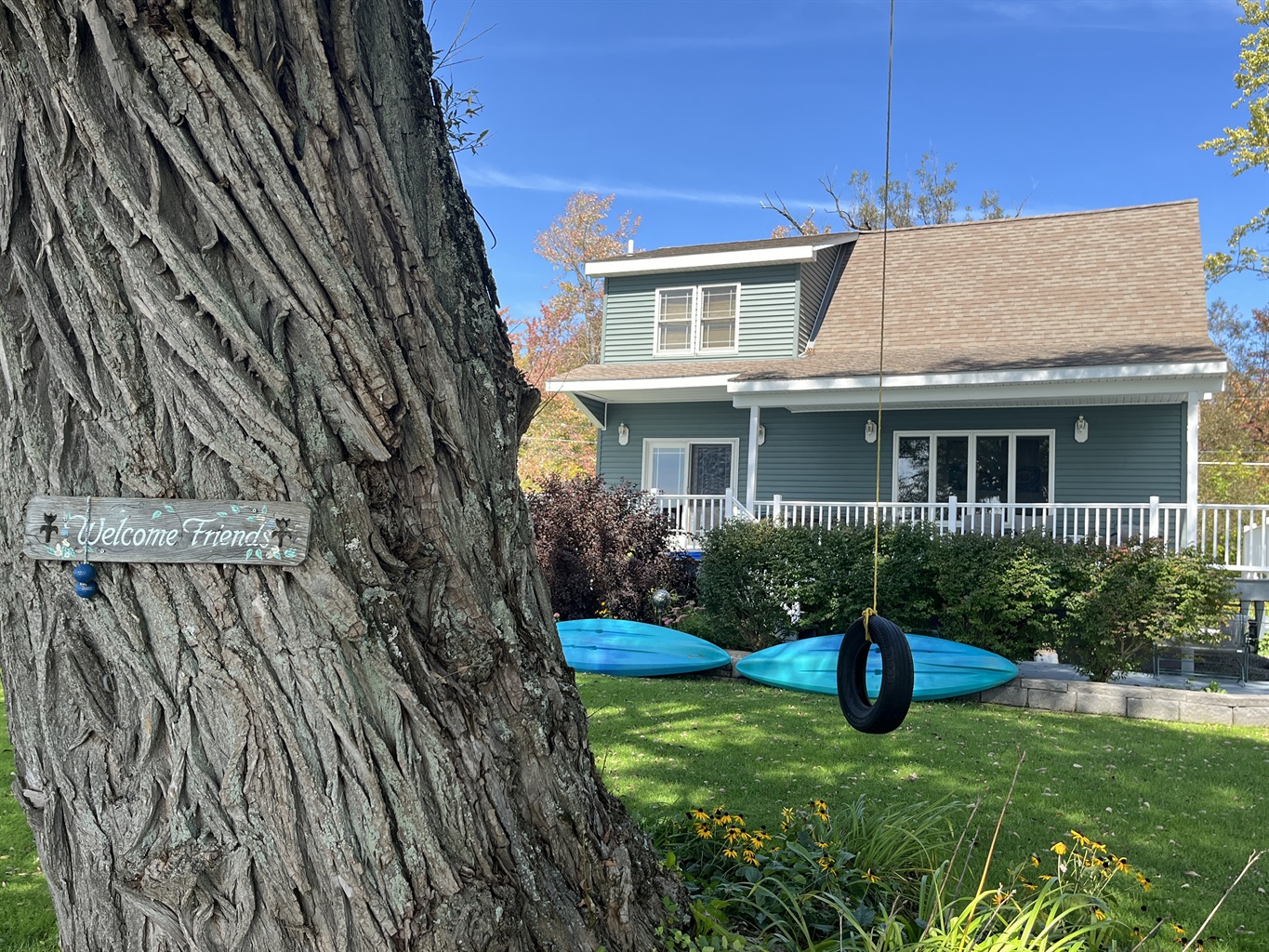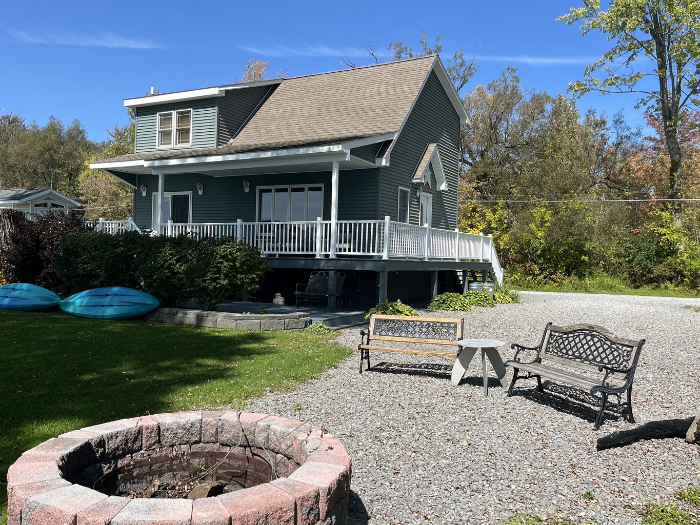 The waterfront is complete with a kayak, row boat and a private dock – great for fishing and boating. Guests gather on the 350 square foot porch that is partially covered or around the fire pit with a campfire in the evenings. Another deck is located at ground level.