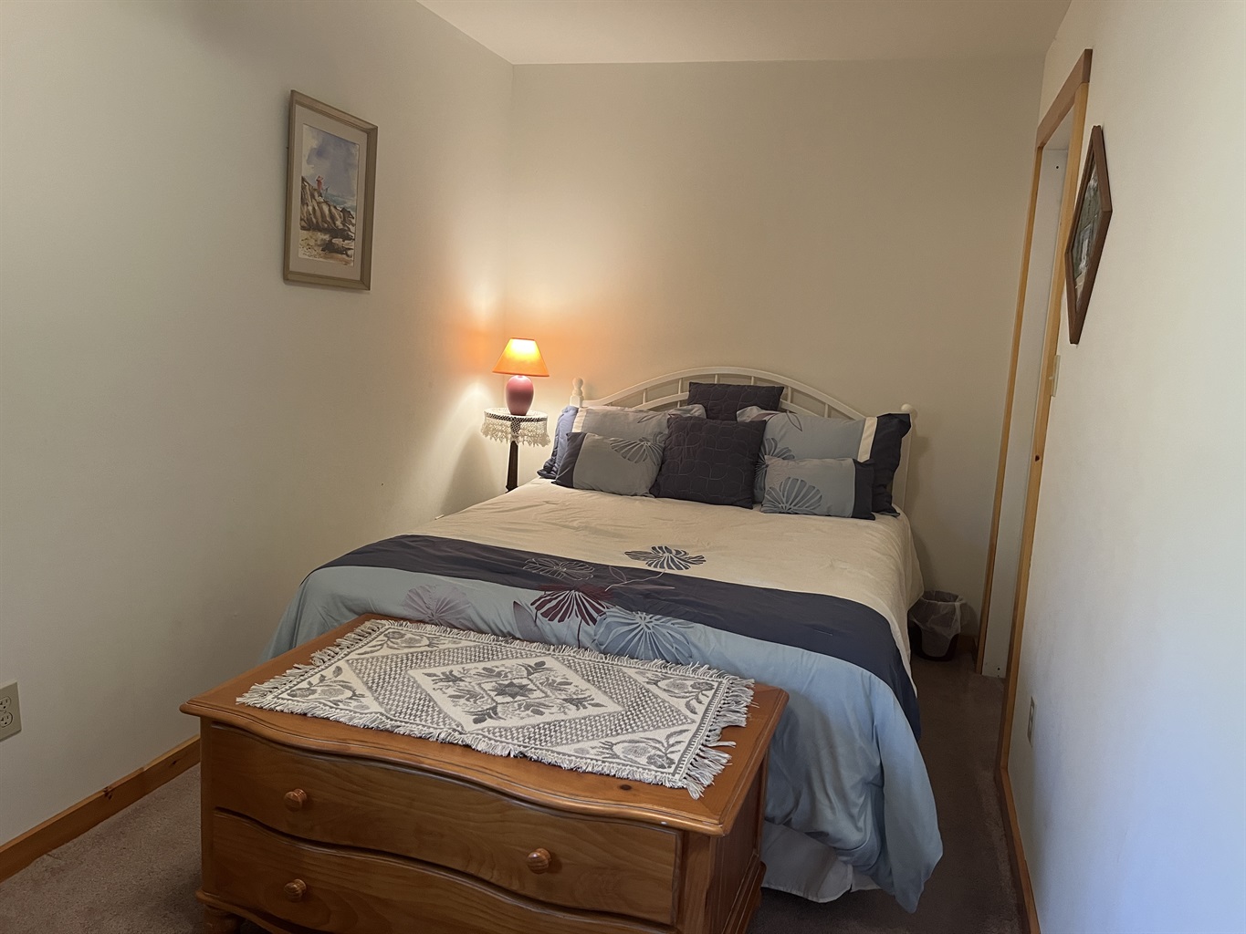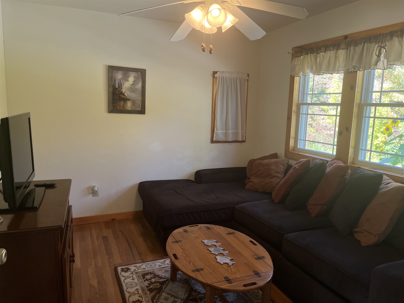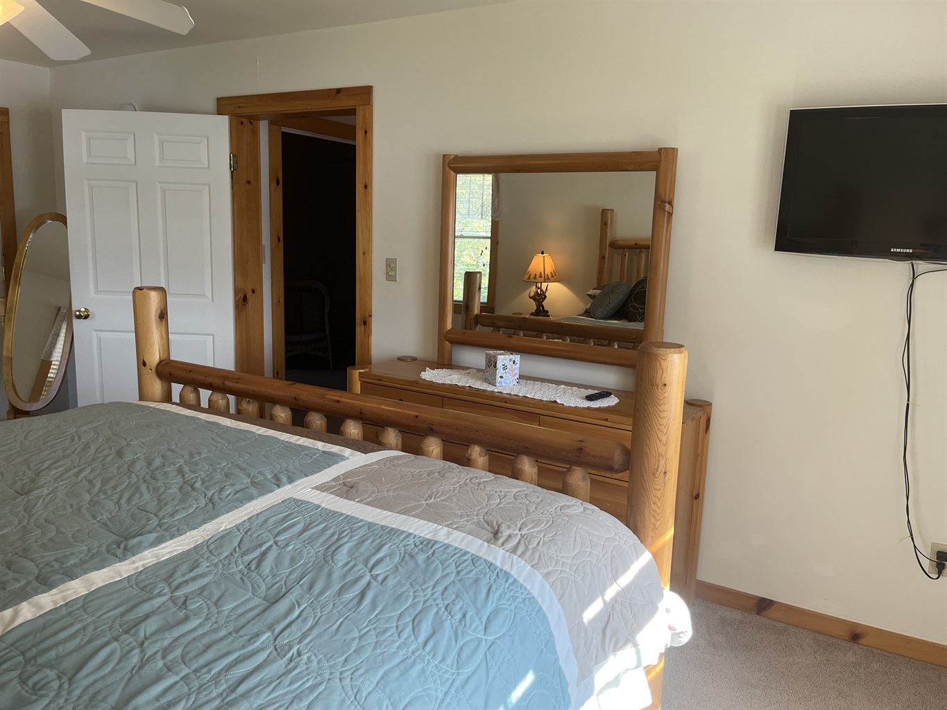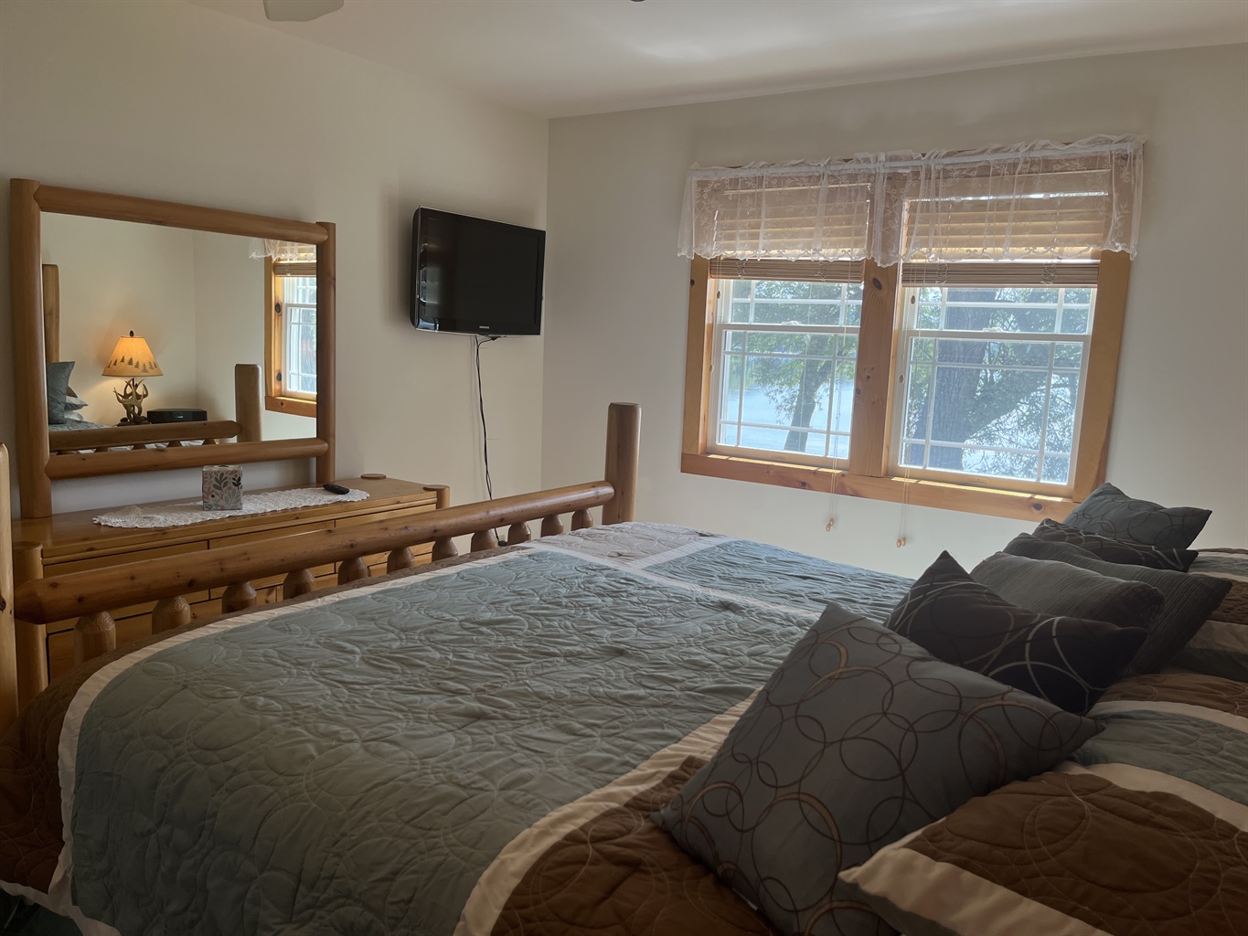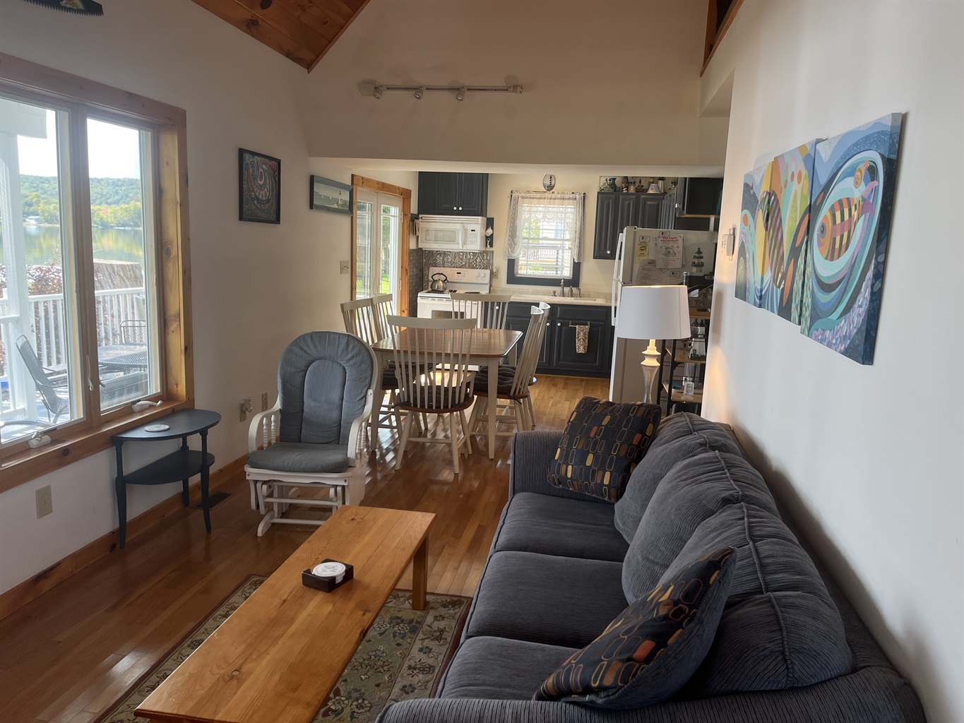 The waterfront is complete with a kayak, row boat and a private dock – great for fishing and boating. Guests gather on the 350 square foot porch that is partially covered or around the fire pit with a campfire in the evenings. Another deck is located at ground level.