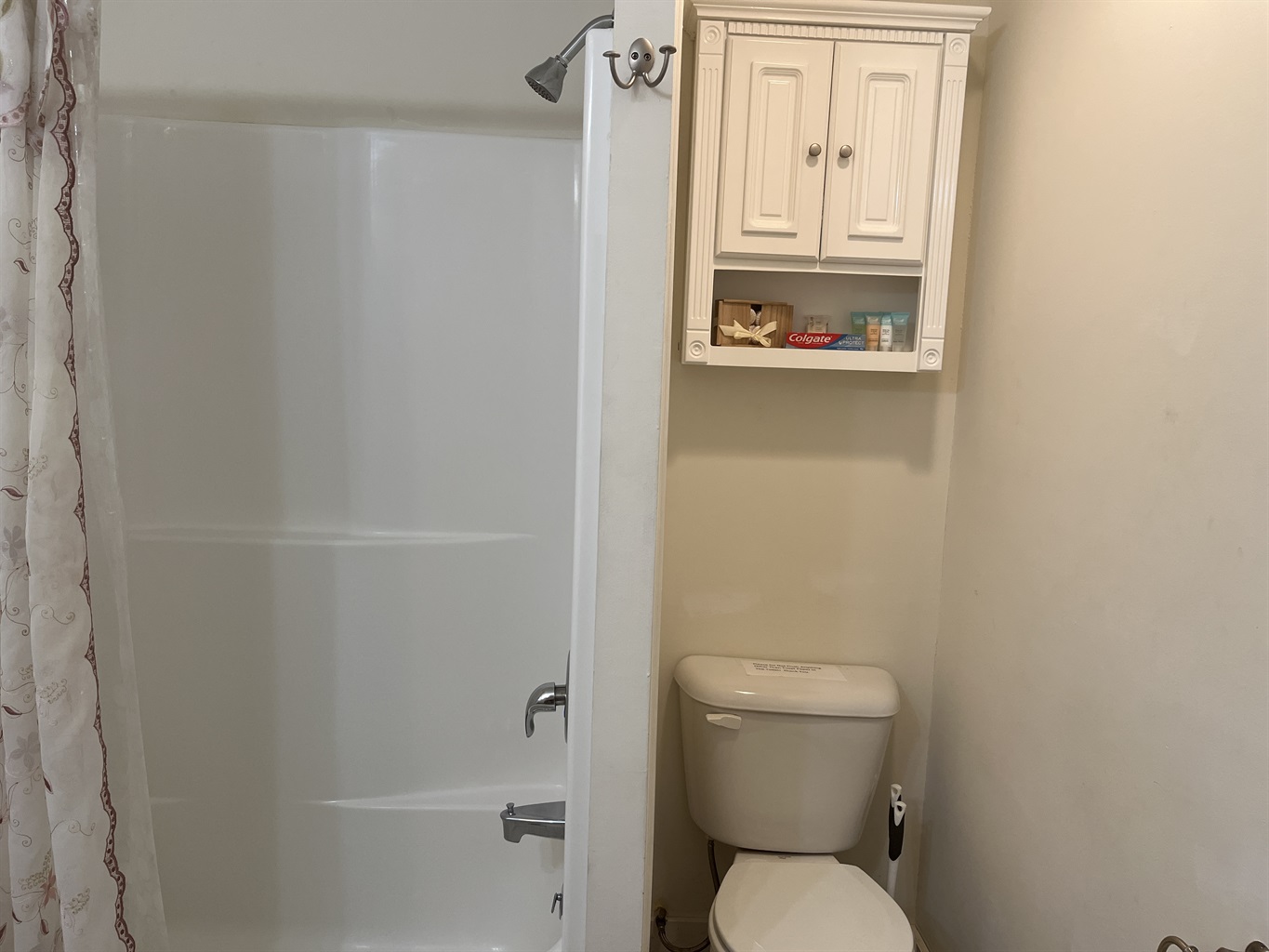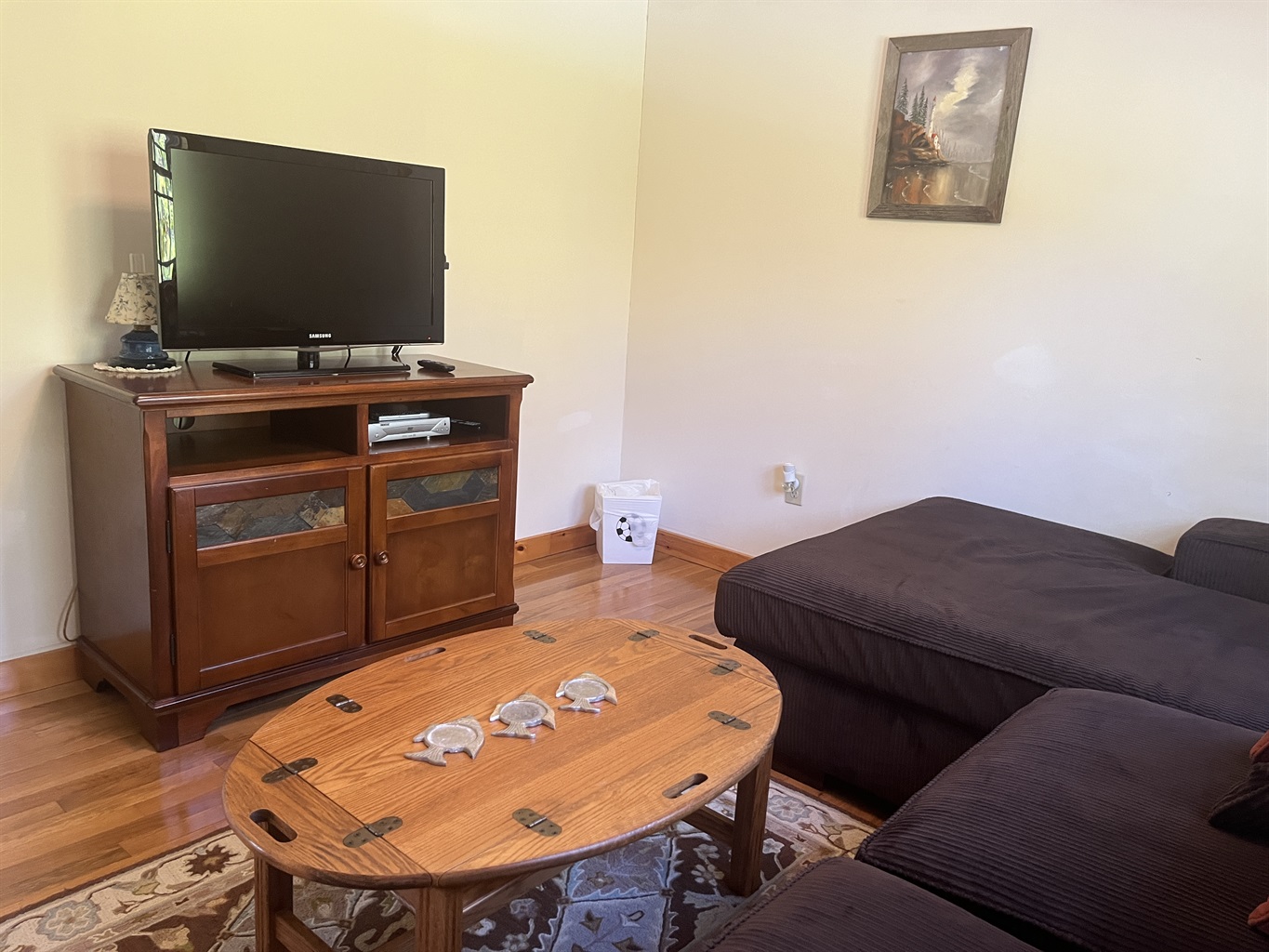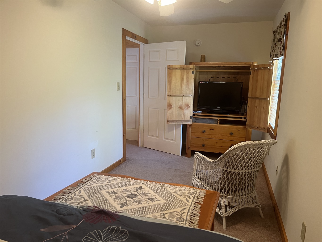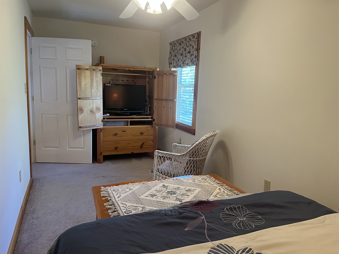 The waterfront is complete with a kayak, row boat and a private dock – great for fishing and boating. Guests gather on the 350 square foot porch that is partially covered or around the fire pit with a campfire in the evenings. Another deck is located at ground level.