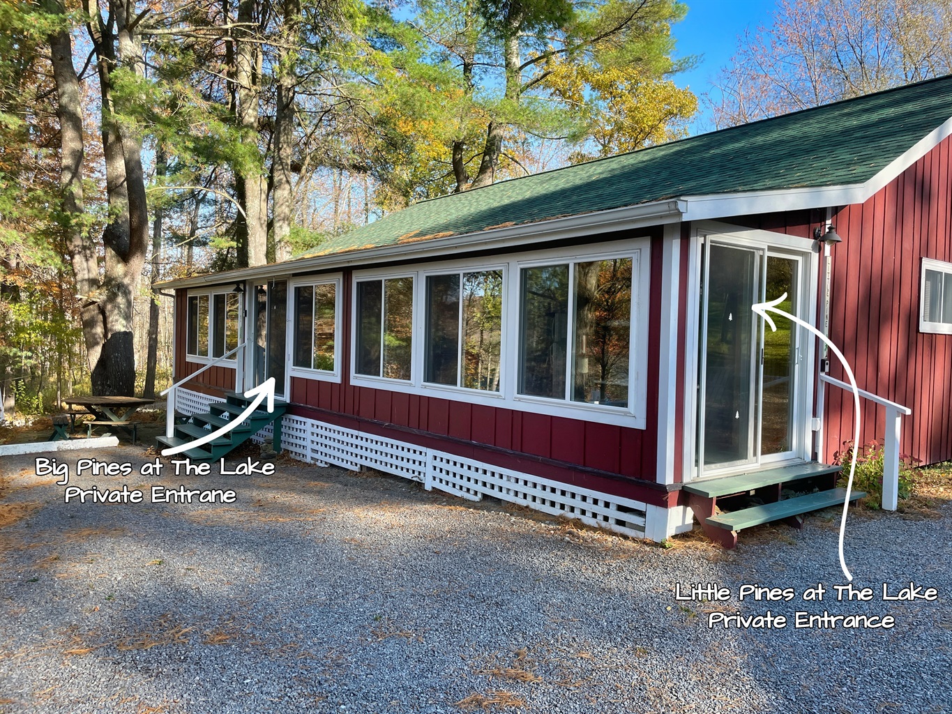 Big pines in one of two units for rent, located on the north side is Big Pines at the lake. There is private entrance and a designated parking area for Big Pines. The interior has been recently updated with a contemporary feel while still maintaining the lake cottage charm.
