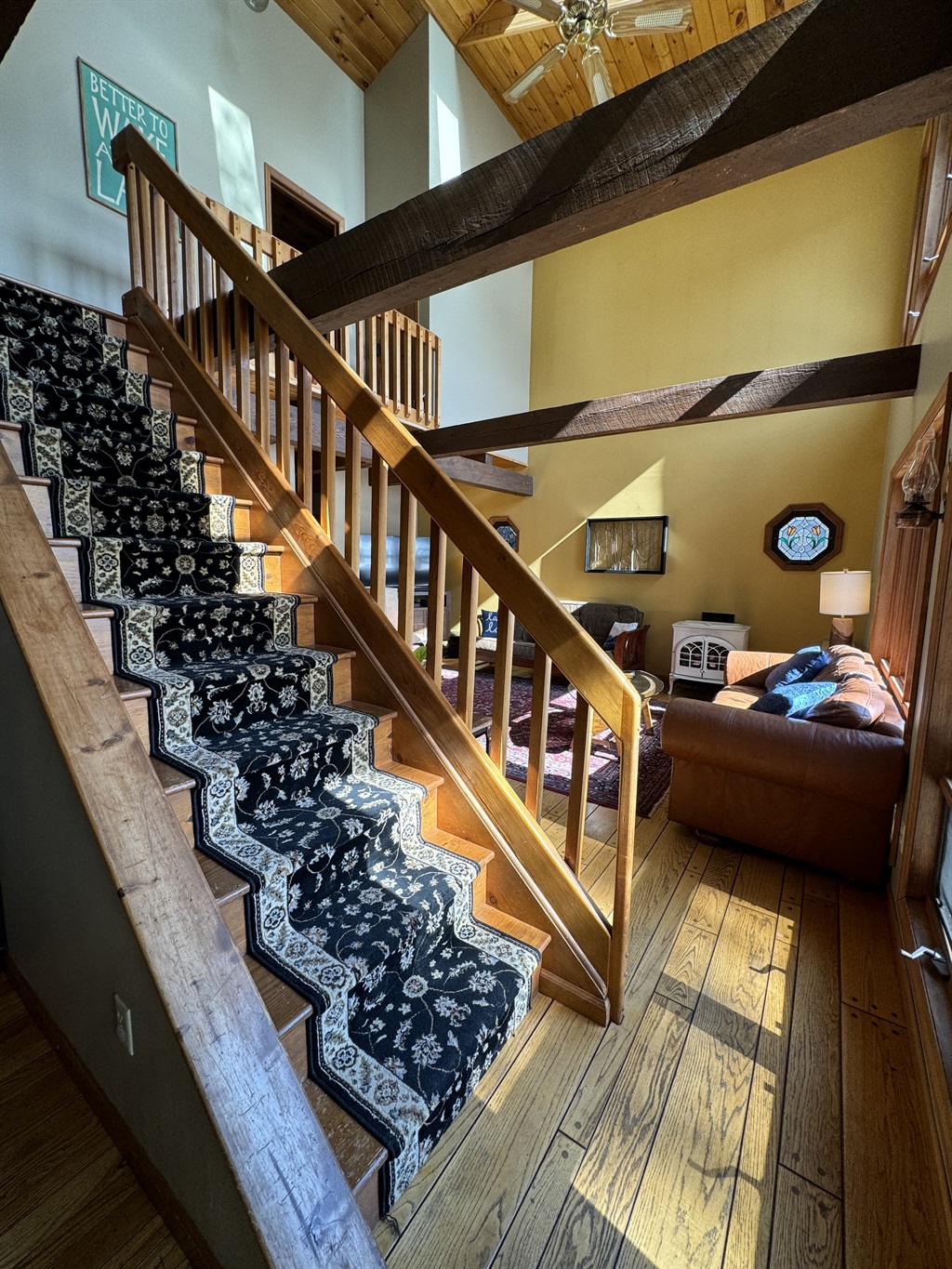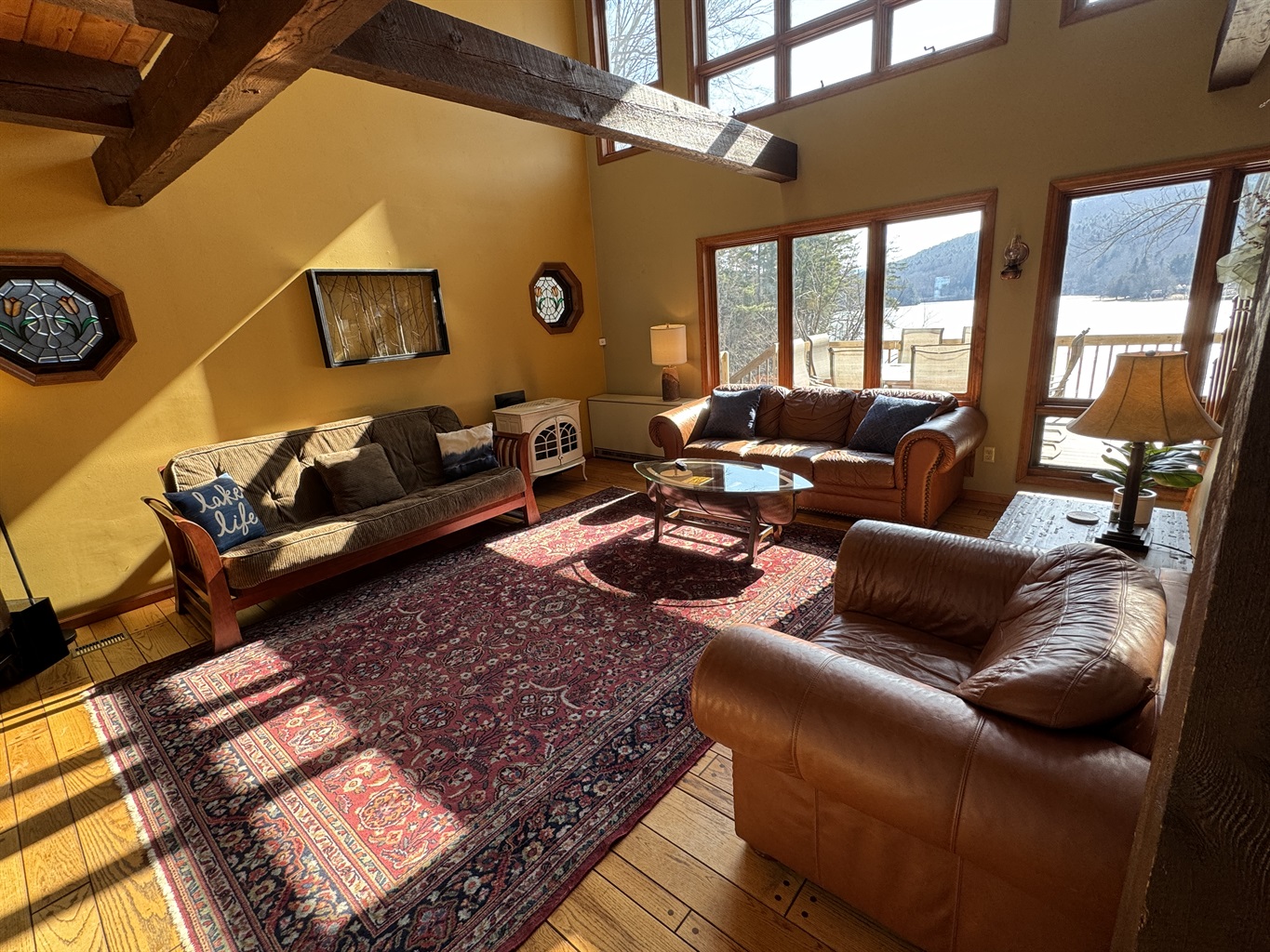 The interior takes full advantage of the waterfront views with floor-to-ceiling windows letting in an amazing amount of wonderful natural light in the main area! The living room is an easy place to gather whether you are enjoying a good book or watching the huge Smart TV. If you rent in the cooler off-season months snuggle up by the gas woodstove. The main floor has a full bathroom just off the entry with a shower and washer/dryer. On the main floor, there is the dining room overlooking the water with seating for 8, leading into the fully equipped kitchen where you will find everything you need to prepare a meal for your crew. Don't feel like cooking? Cooperstown is just a short drive away or head south to Oneonta for even more dining options. If you are attending the youth baseball tournaments in the summer this home is centrally located between the two parks, coming back to the lake is a nice break from all the baseball! Enjoy a nice BBQ on the deck with seating and a gas grill overlooking the lake.