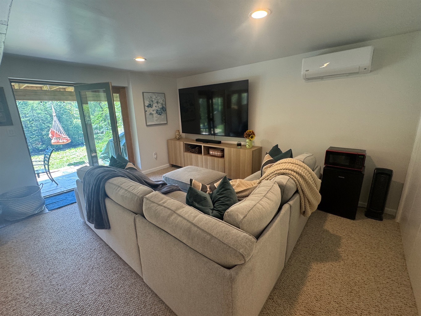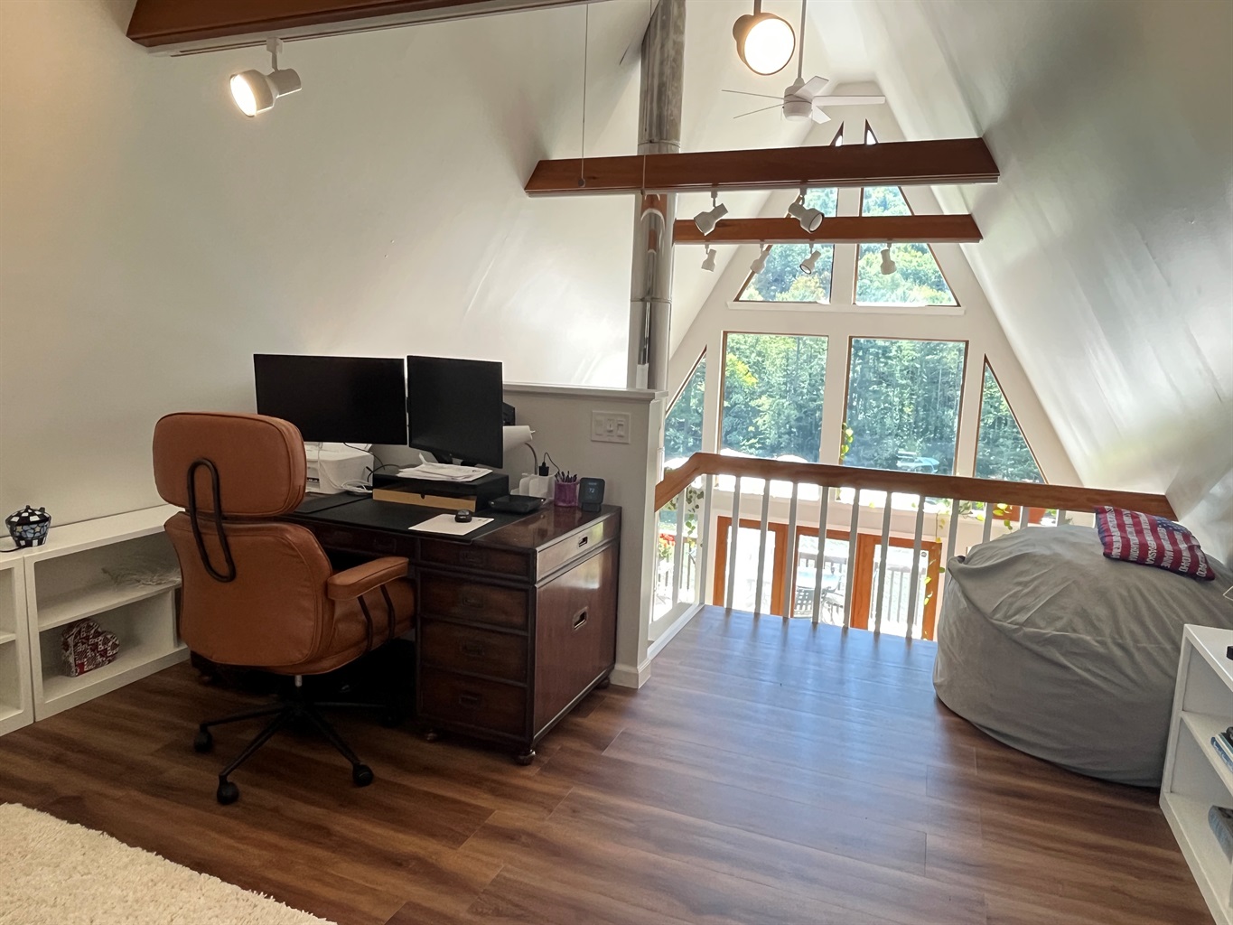 The main level of Casa Bella has a wonderful great room, with large windows facing the water, a user-friendly kitchen, a full bathroom with tub/shower, and a Queen bedroom. The open kitchen, living, dining area is a great way to stay connected with your group while you bounce between meal prep, meals, and relaxing. A door to the water-facing deck makes it super easy to relax and eat outside. Up the open staircase to the office loft, you will find a great workspace for those who have to Work From "Home". This space has a desk, an office chair, as well as 2 monitors and a printer. There will be no reason to call in sick, once you sit down here with the large windows in front of you, work won't seem all that bad. On the lower level there is a great media room, complete with 85", yes 85 inch, SmartTV, comfy couches, and oversized beanbag loungers, as well as a futon. Silding doors open to a lower level patio with table and chairs and direct access to the waterfront stairs (to be installed soon). The lower level also has a 2nd Queen bedroom and another full bathroom with tub/shower.
