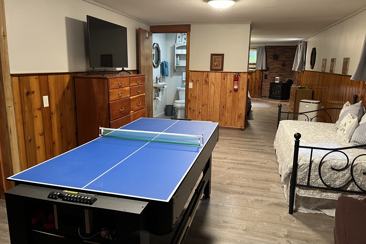 There are two bedrooms just down the hall from the kitchen/dining area, a King and a Queen. You’ll find a shared bathroom off the hallway between the bedrooms and the kitchen. On the lower level, there is a game room with a combo ping pong/air hockey table and SmartTv. Another bathroom with a tile shower is right next to the game room, and beyond the game room is another sleeping area with a double bed and a twin.