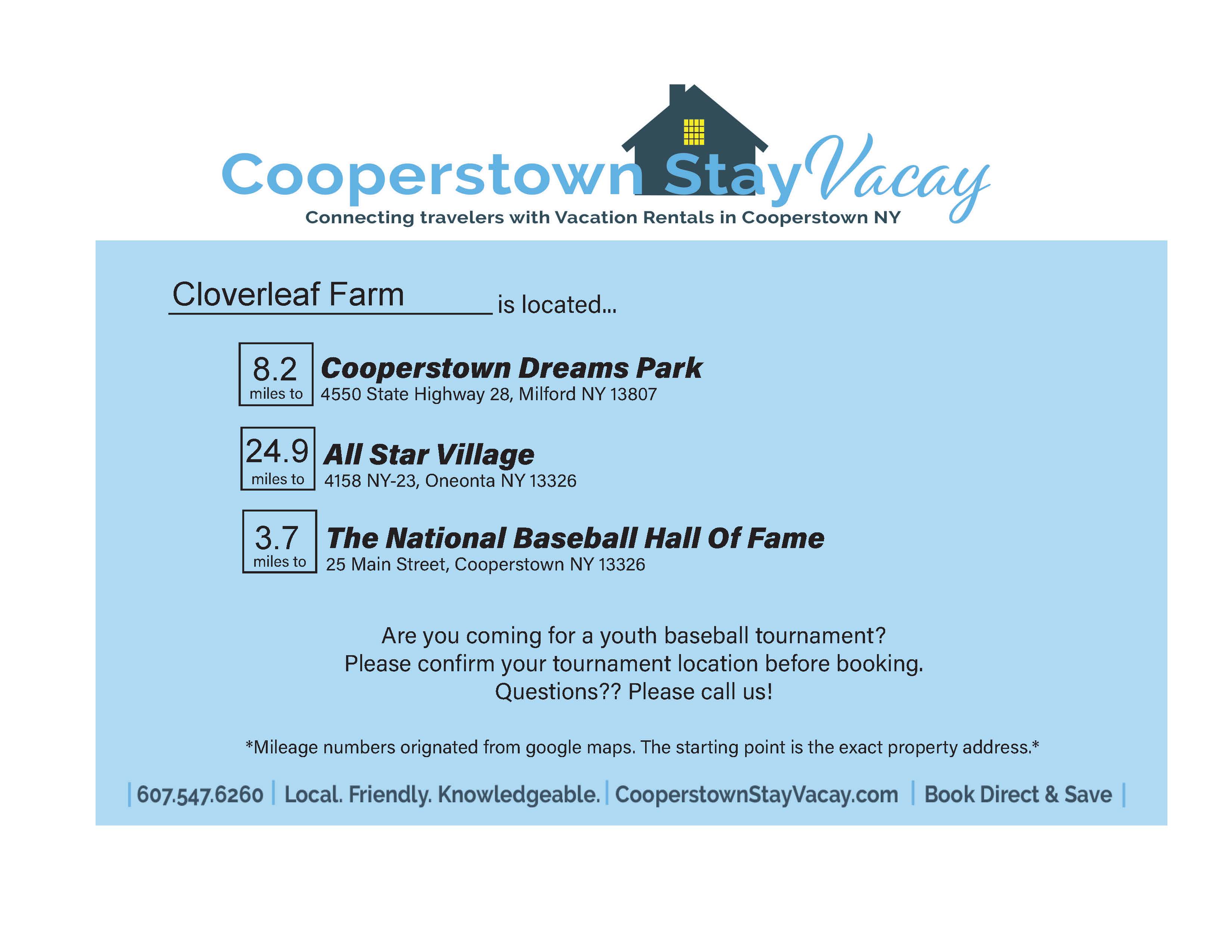 The location is great, only 5 minute drive to the National Baseball Hall of Fame in downtown Cooperstown NY. Coming to our area for a baseball tournament ? Cloverleaf Farm is less than a 15 minute drive to Cooperstown Dreams Park.