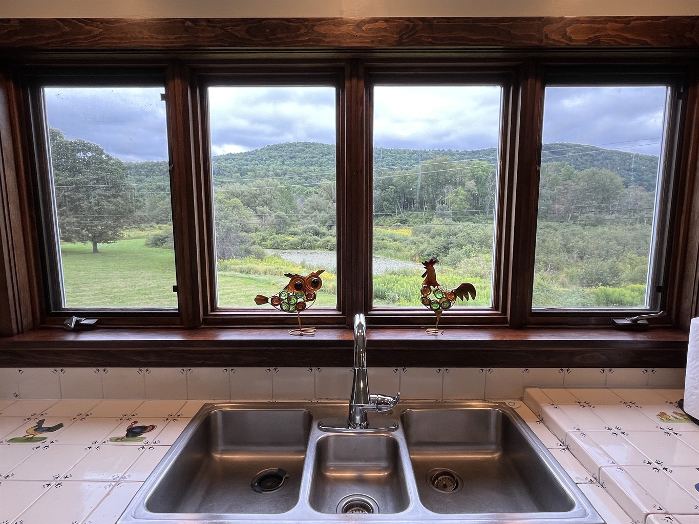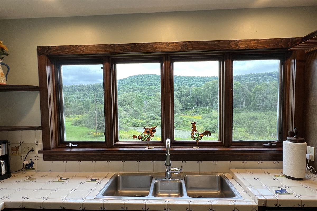 The property is surrounded by lush greenery and a large open lawn perfect to enjoy outdoor activities! There is a beautiful scenic pond visible from the kitchen sink.