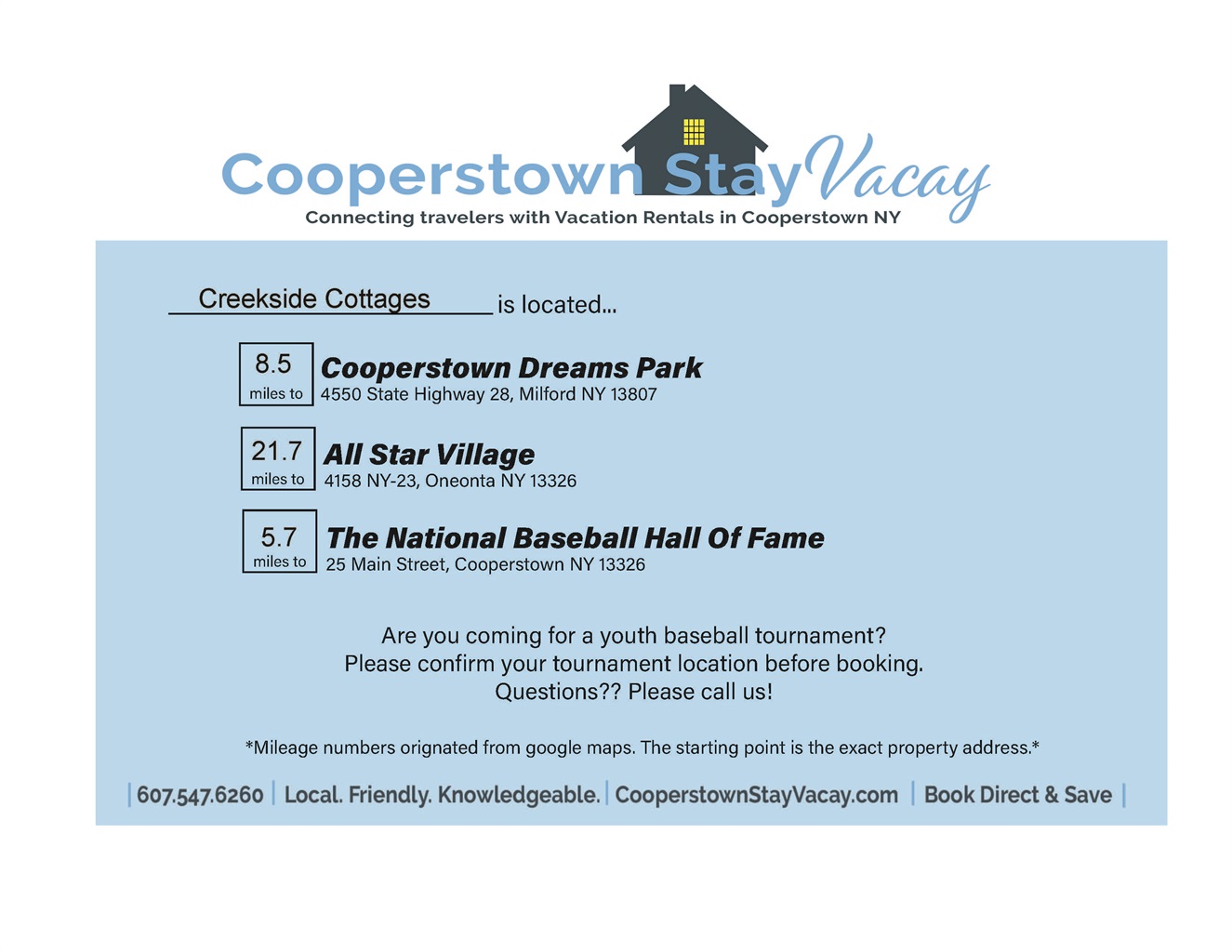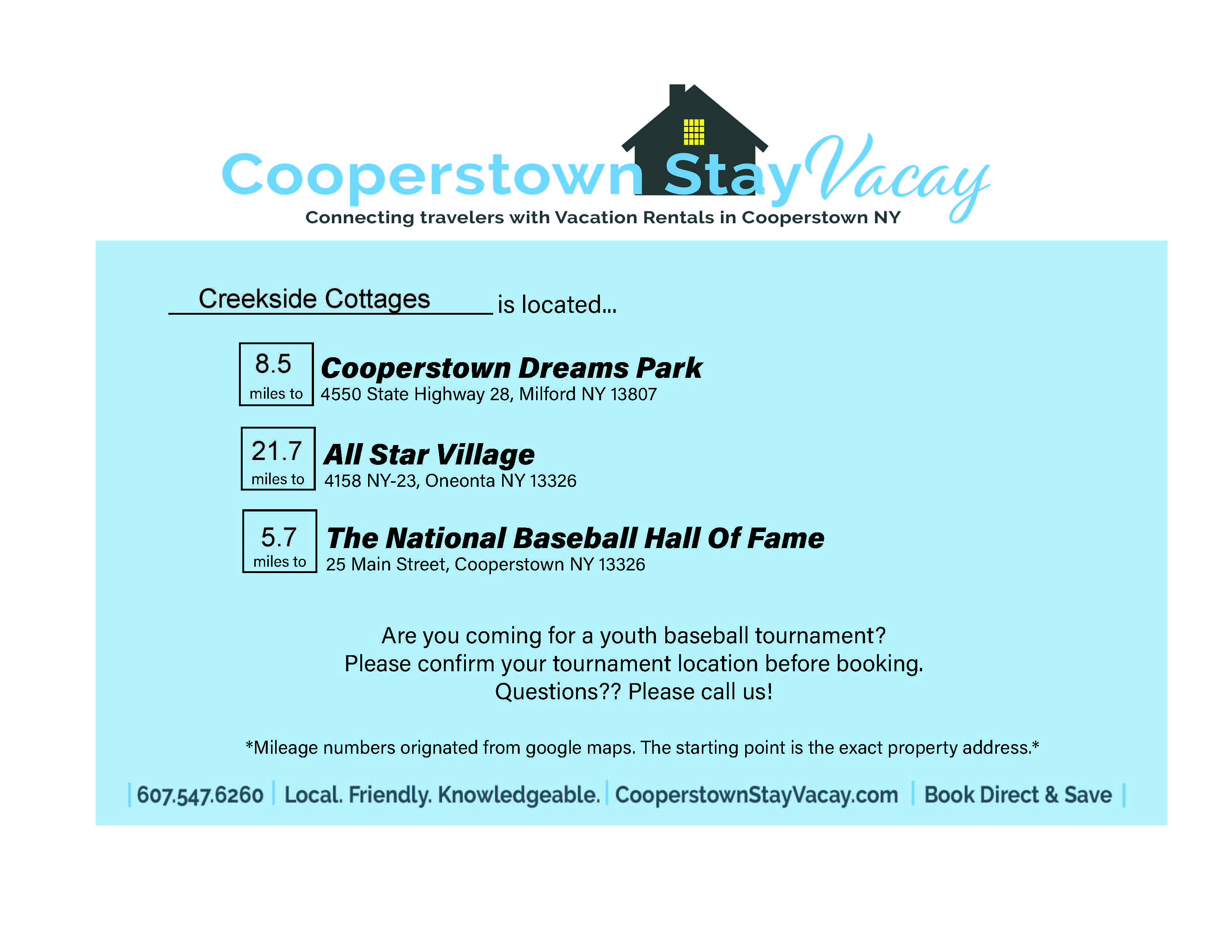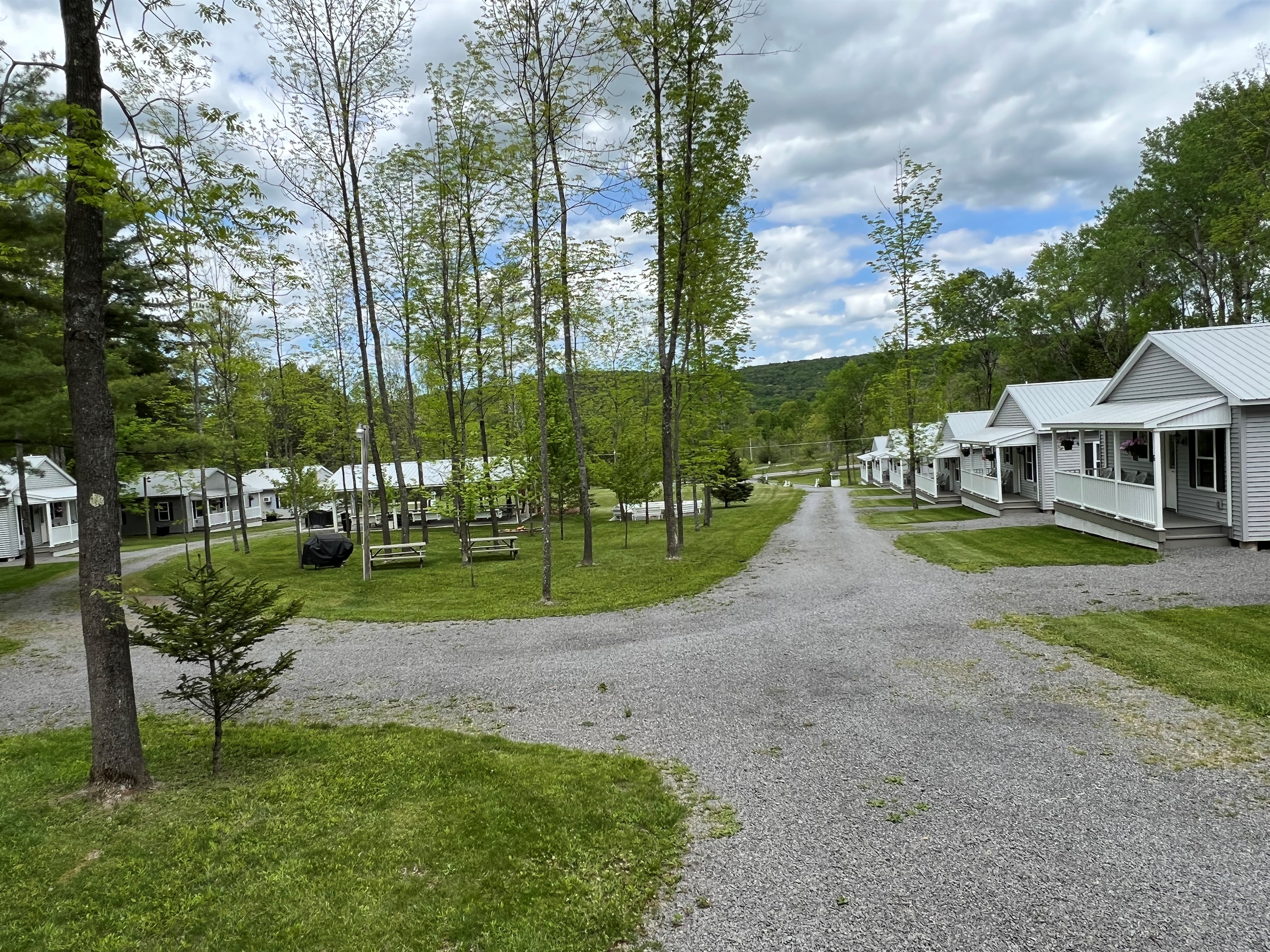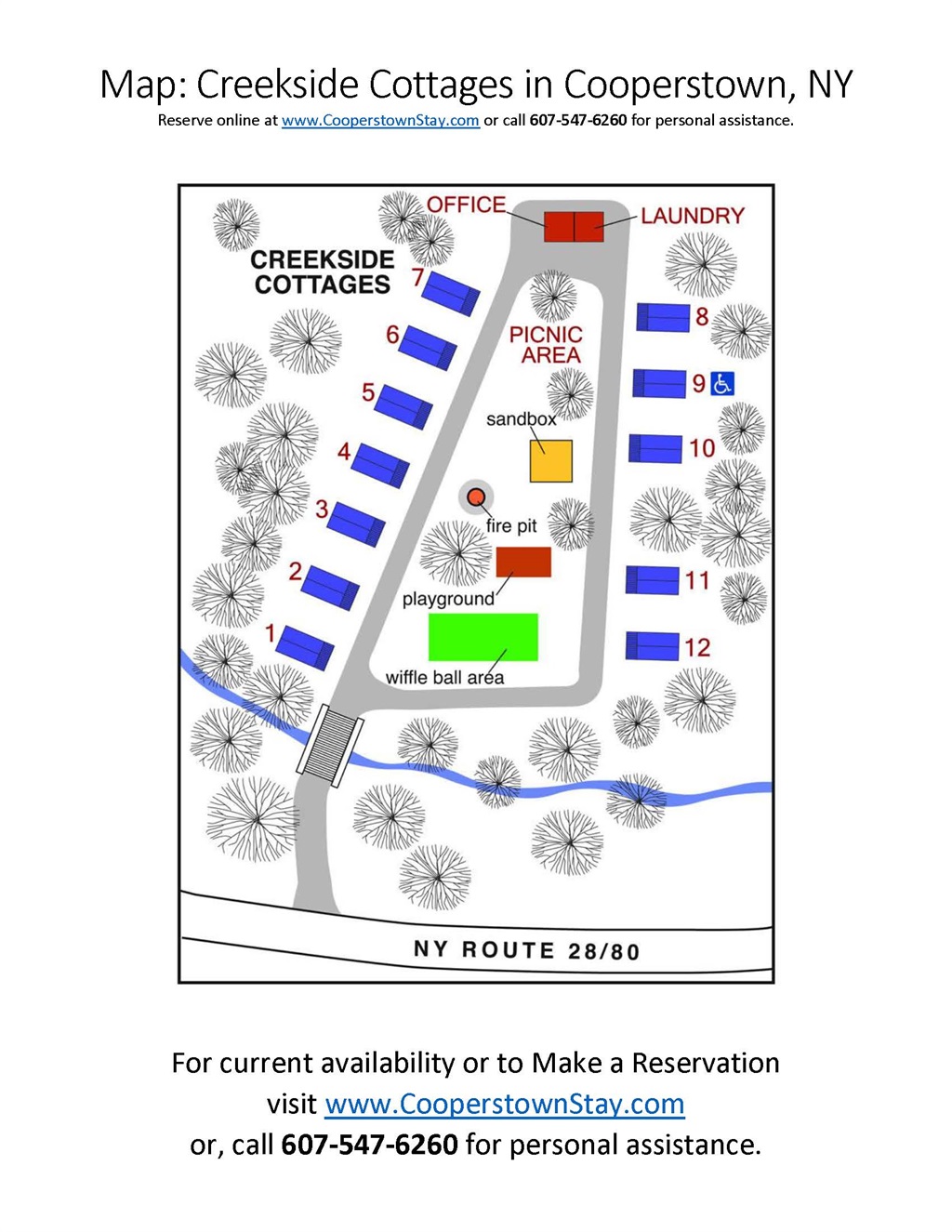 Creekside Cottages - is a group of custom built cottages nestled in a lightly wooded setting in the Fly Creek area just northwest of Cooperstown - very convenient to the village of Cooperstown and to the Cooperstown Dreams Park. The grounds are spacious and very well maintained. Your hosts provide a common picnic area with multiple picnic tables and gas grills. There is a large open area in the lawn with community fire pit where families can gather and enjoy a campfire under the stars.