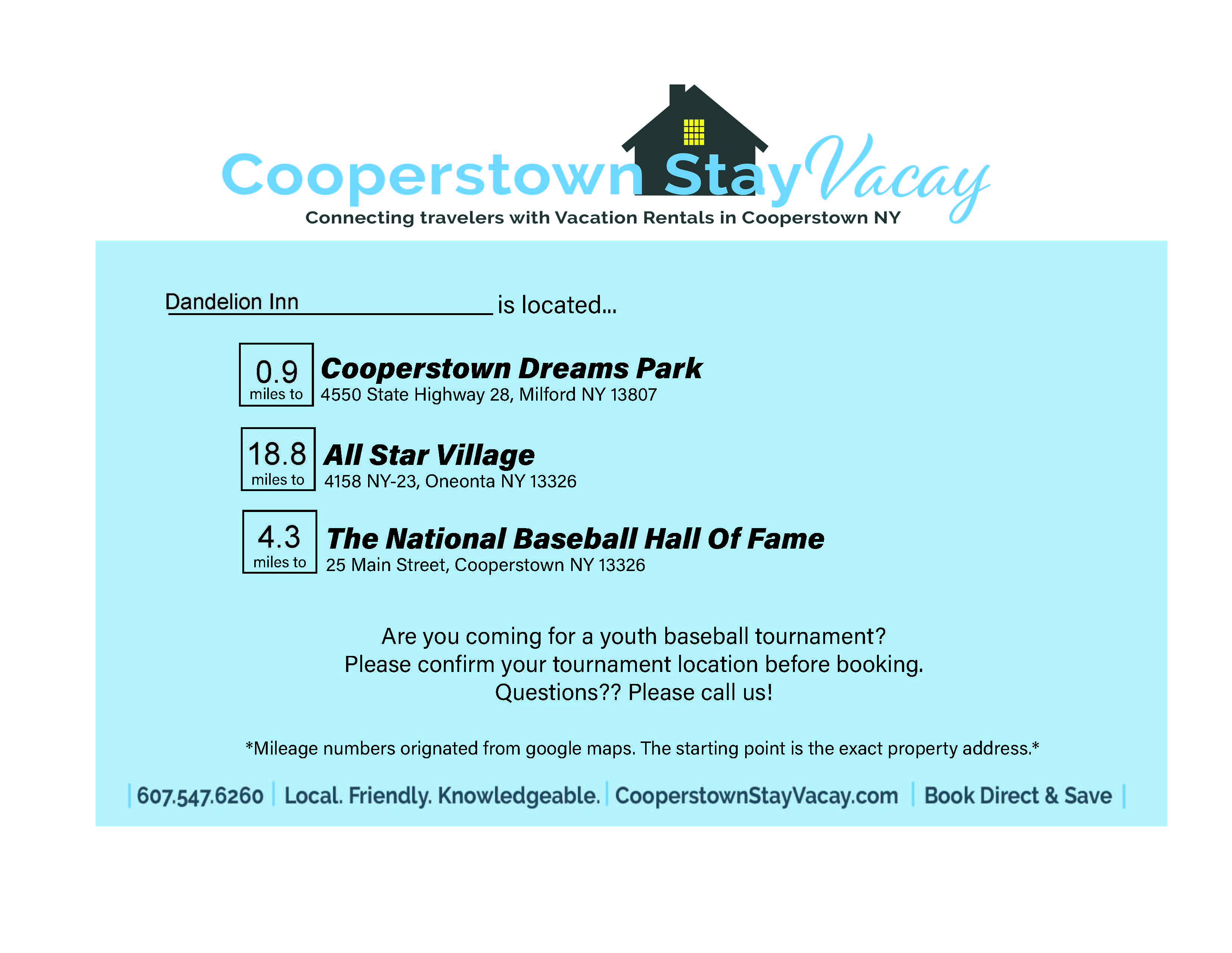 Dandelion Under 1 mile to Cooperstown Dreams Park, 2 units as one ~ great for groups!