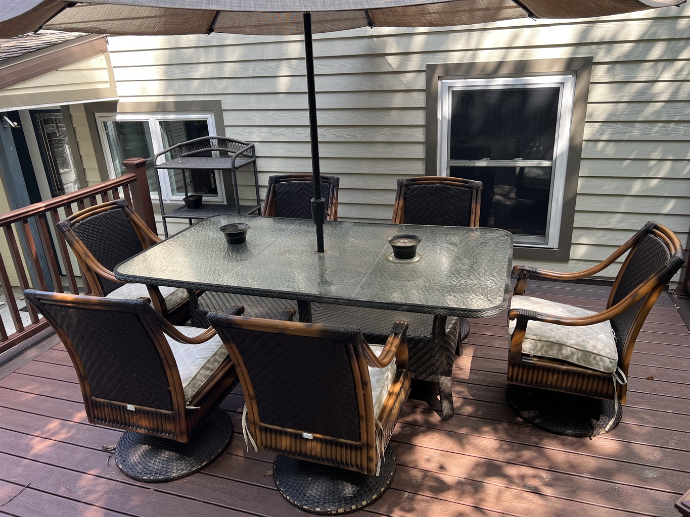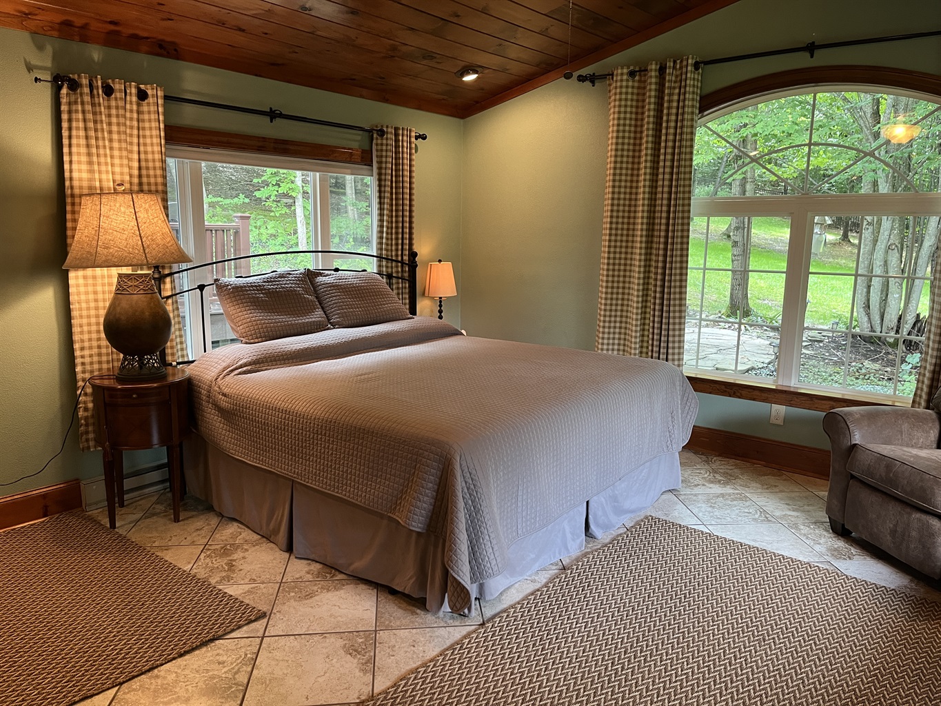 The décor is a pleasing eclectic combination of custom made tables, chandeliers and contemporary items. Attention has been given to every detail, including boosters to give a strong cell signal. The first floor king bedroom has a cathedral ceiling completed with pine boards and a spacious seating area.