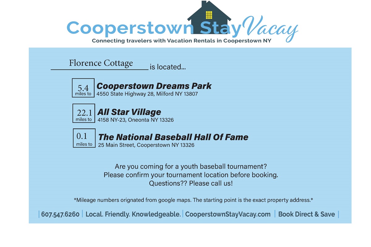 Florence Cottage - Great location in the heart of Cooperstown village! Florence cottage is just one block from the National Baseball Hall of Fame and the shops and restaurants on Main Street. This apartment is part of a historic building, originally built by a ship's captain. It was the home of the village doctor for many decades in the 1900's.