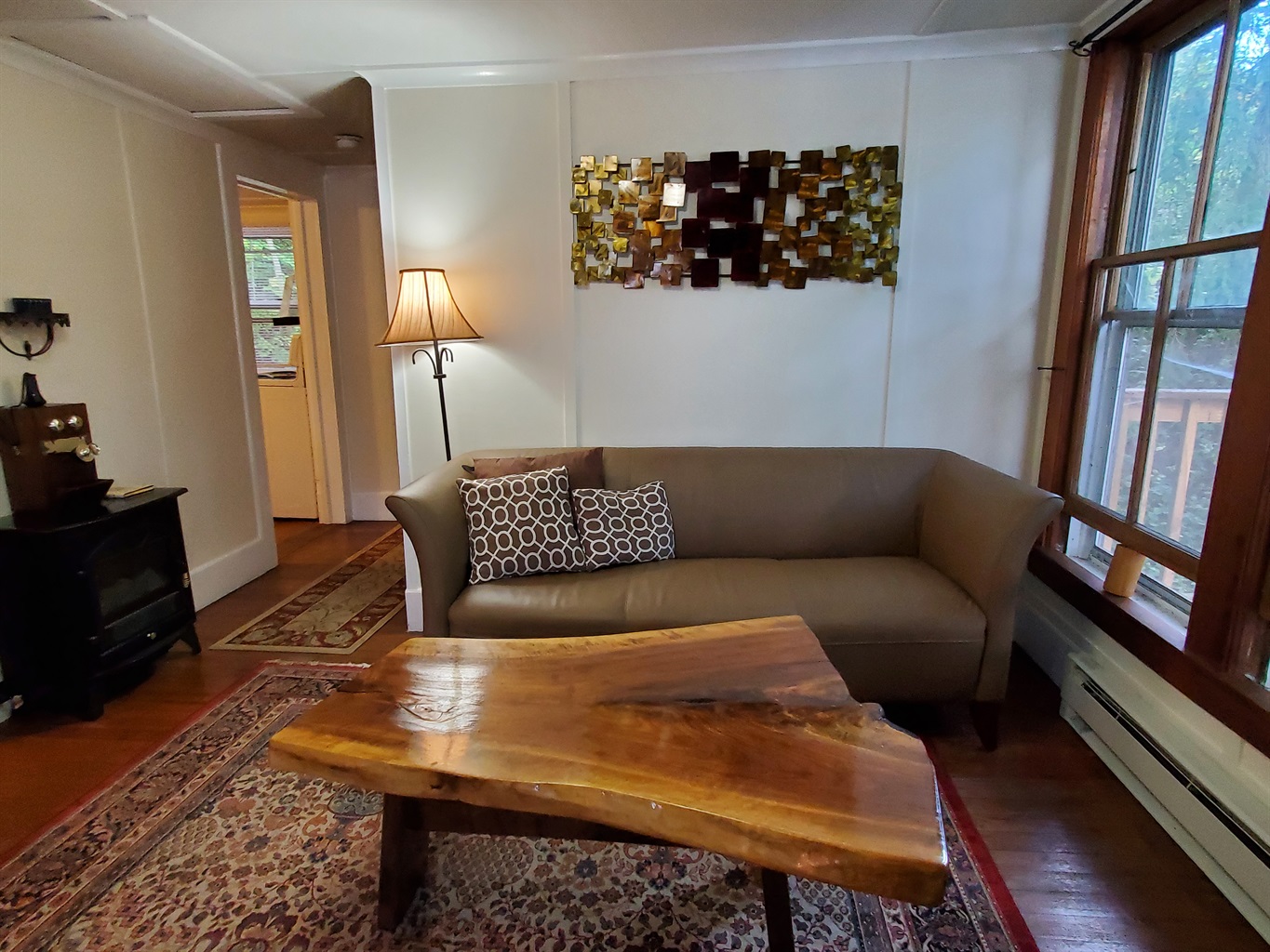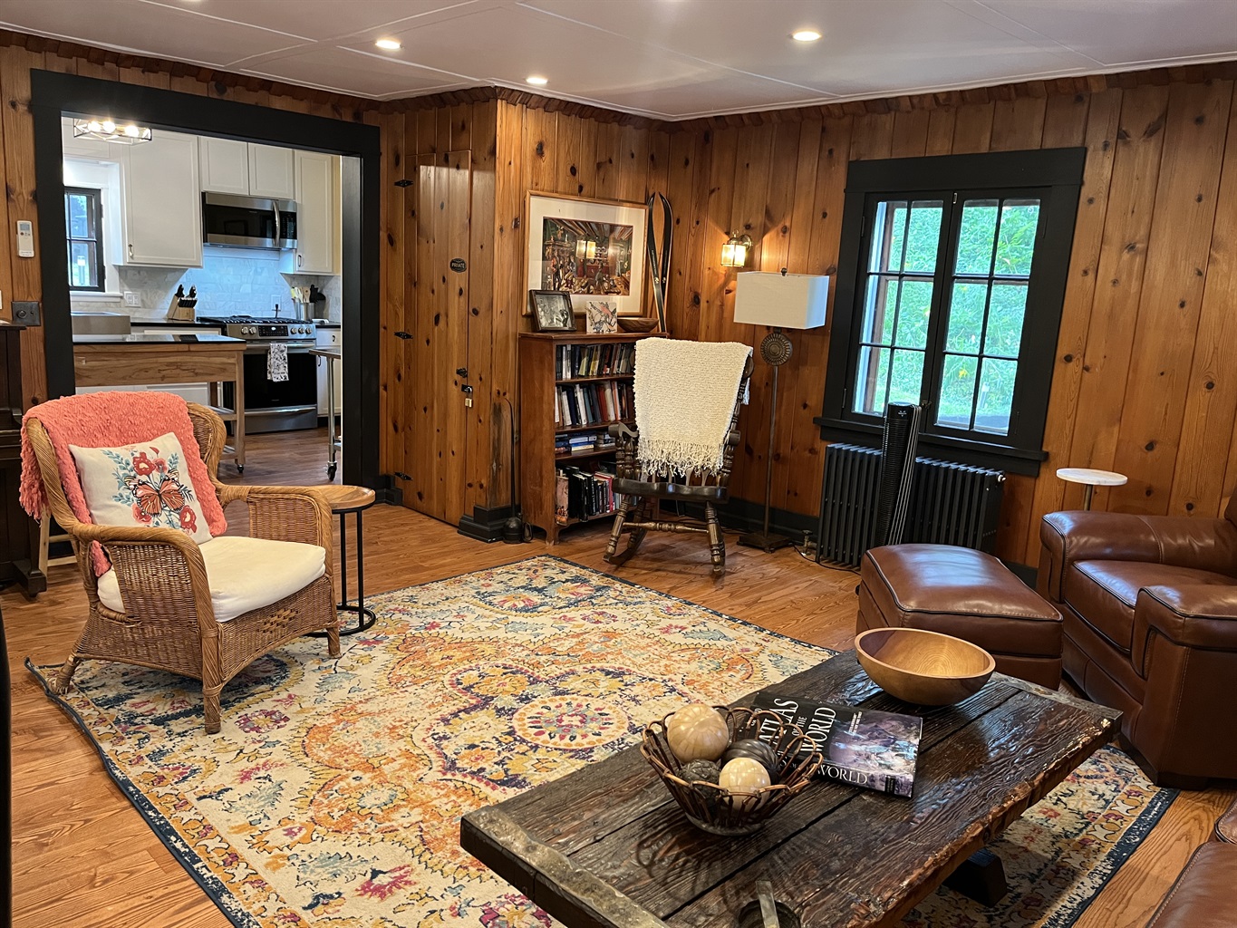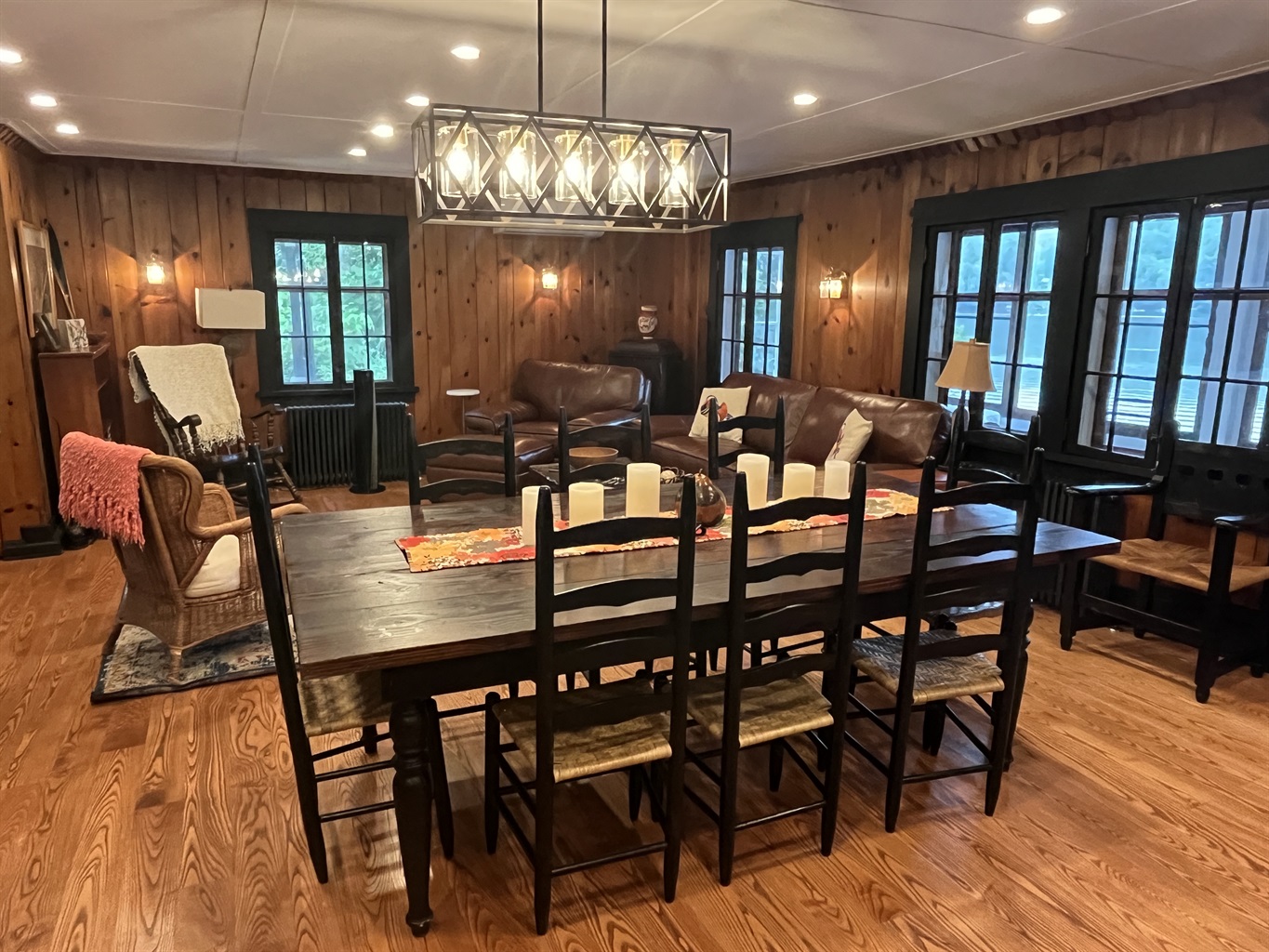 The décor is a pleasant blend of modern amenities and rustic antiques. The great room is highlighted by original “lawyer’s oak paneling”, an oversized, custom-designed farmhouse table, 2 seating areas, and a flat-screen TV along with the original brick fireplace.