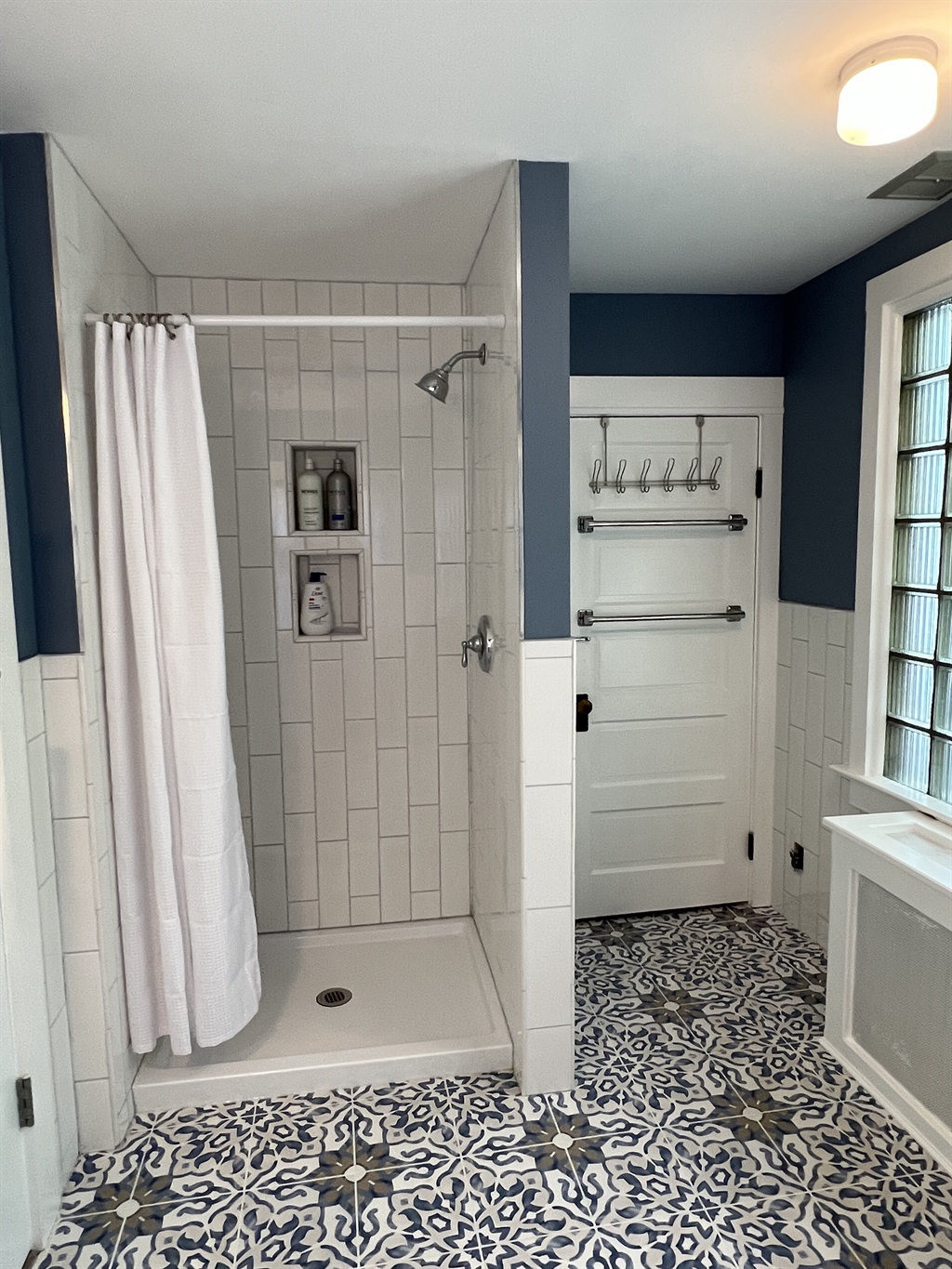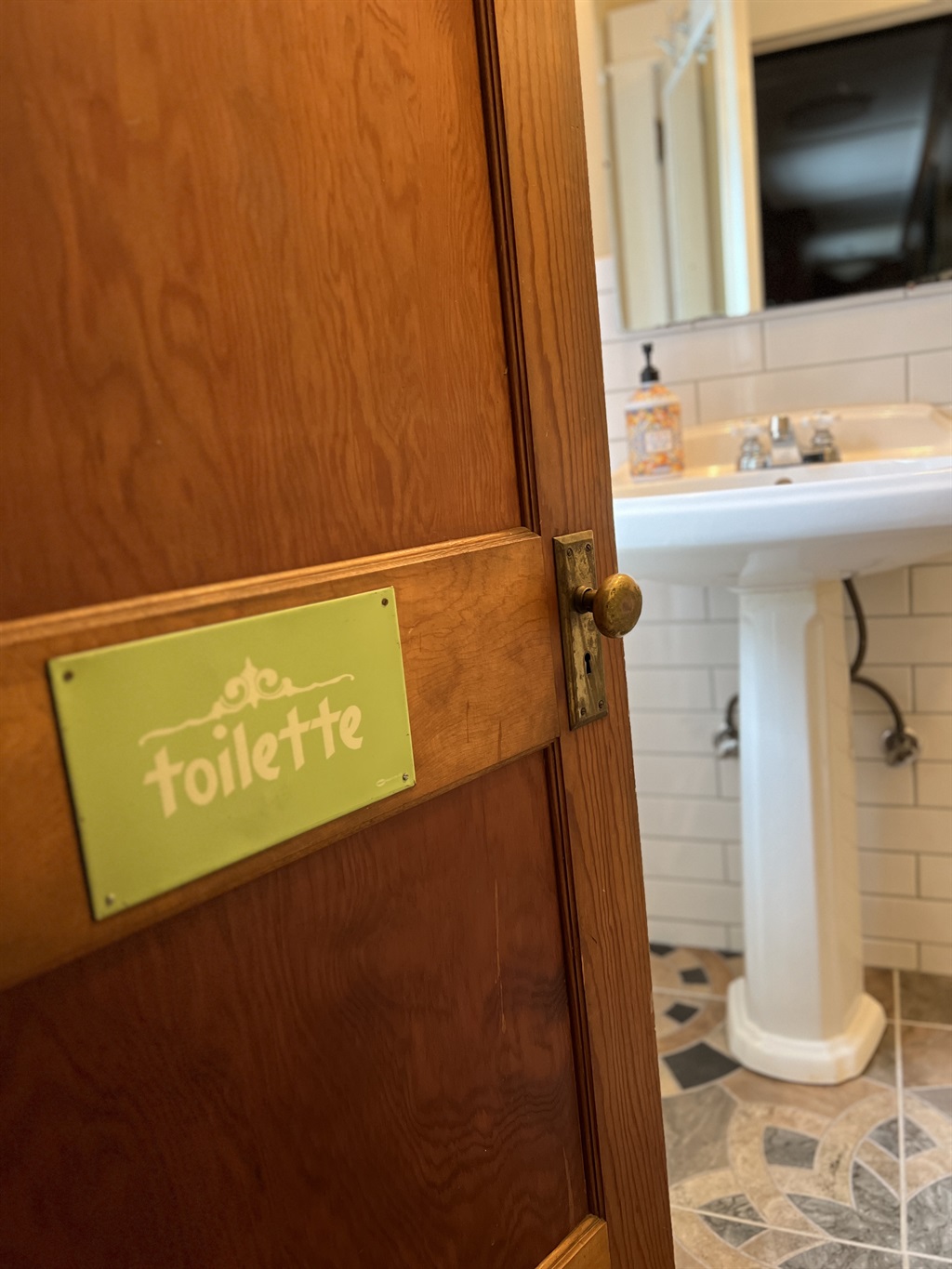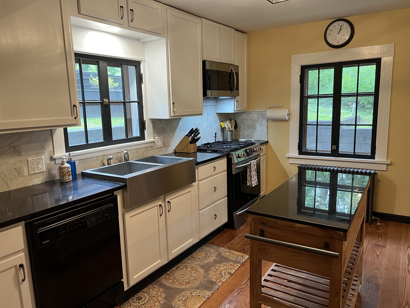 The décor is a pleasant blend of modern amenities and rustic antiques. The great room is highlighted by original “lawyer’s oak paneling”, an oversized, custom-designed farmhouse table, 2 seating areas, and a flat-screen TV along with the original brick fireplace.