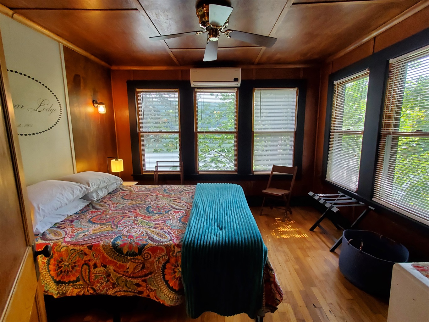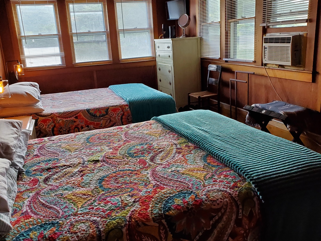 The Boathouse cottage is adjacent to the Lodge, separated only by a gate. With its over-the- lake woodland setting, it offers the most private of accommodations within the compound. The cottage consists of 2 bedrooms, one with a queen bed and a cot and the other with 2 queen beds, full bathroom with tub & shower, fully equipped kitchen with dishwasher and washer/dryer, a comfortable living room, dining room, and a private screened-in porch. The décor is a mix of leather and antiques. It has hardwood floors throughout, plus 3 flat-screen TVs.