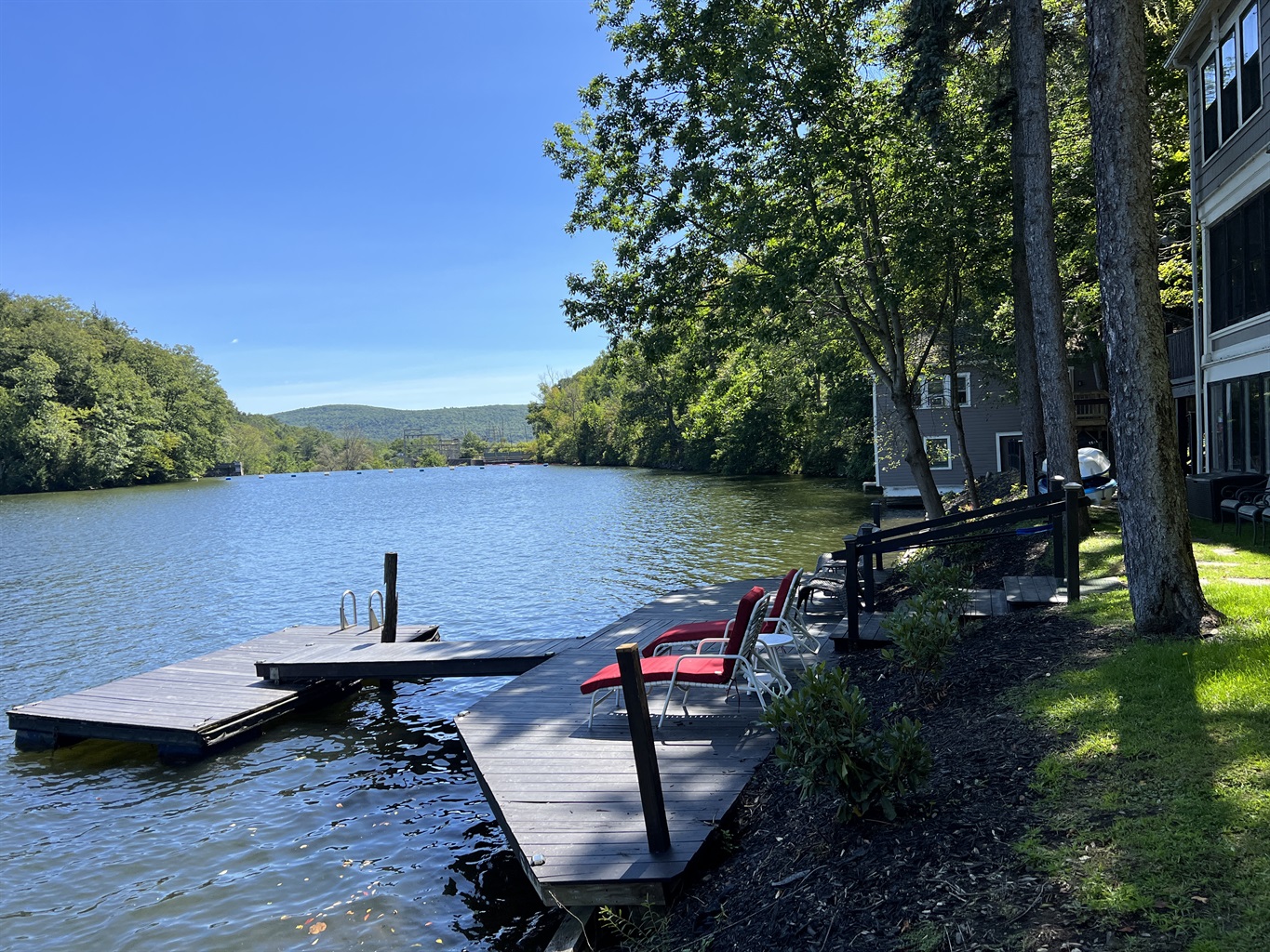 The main level features a large great room with dining and two seating areas. A galley kitchen flows into the dining / living area which opens to a screened-in sleeping porch with a queen bed that spans the width of the house showcasing breathtaking views of the lake. The lower level is a lakefront walk-out and is set up as a game room, bathroom, and laundry room. The bedrooms are all located on the upper level and are set up as three 2-bedroom suites; each queen room overlooks the lake. Each level has its own recently renovated full bathroom. There are hardwood floors throughout.