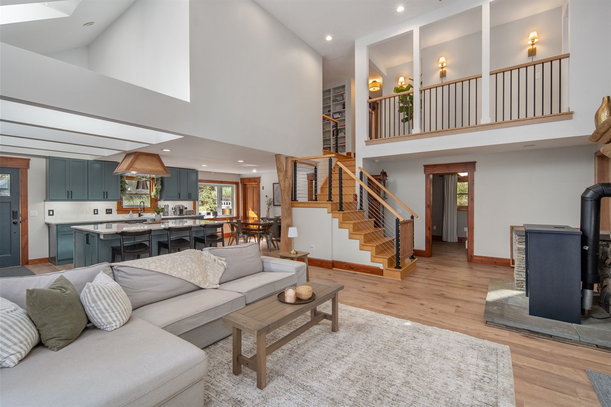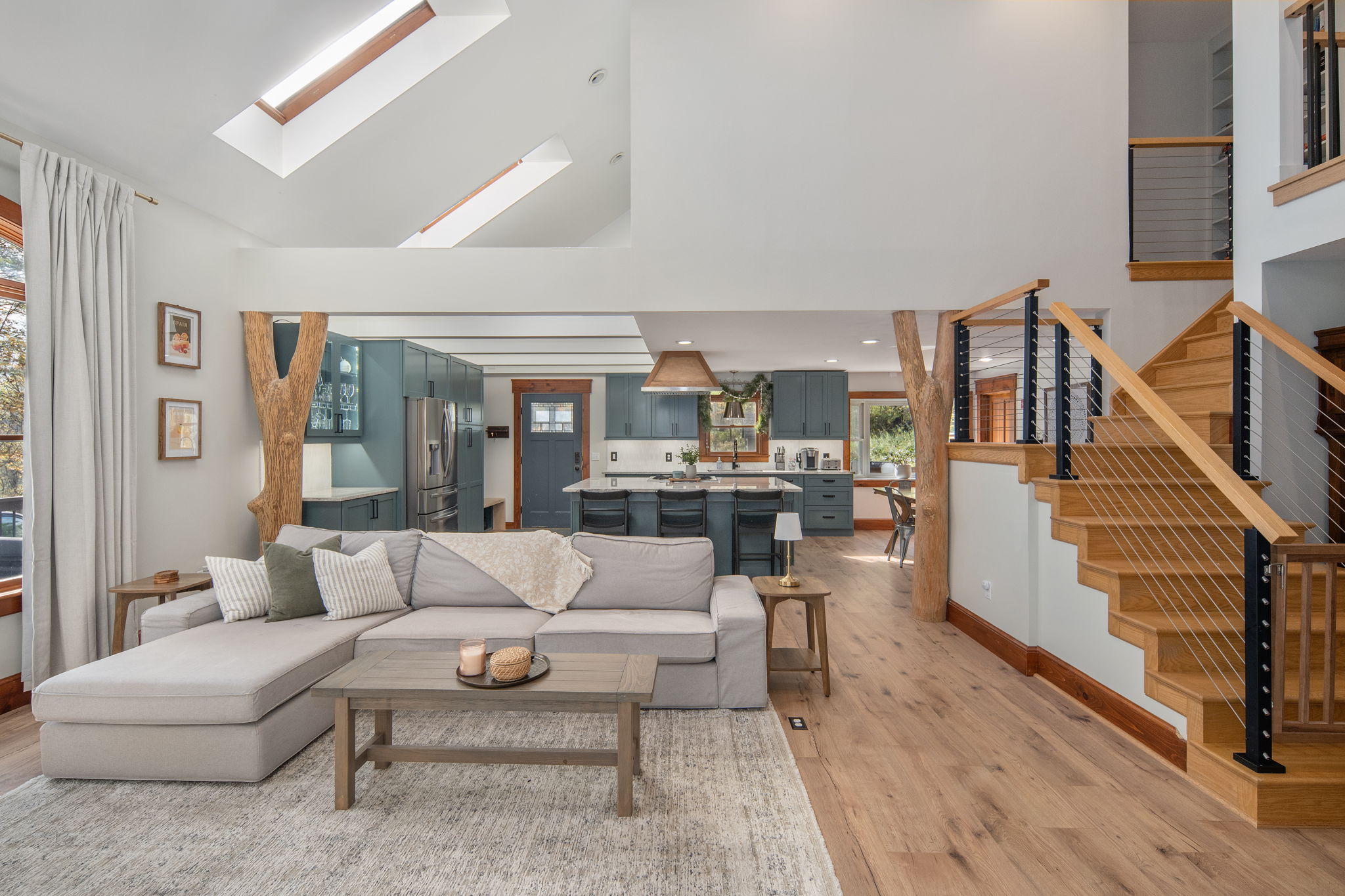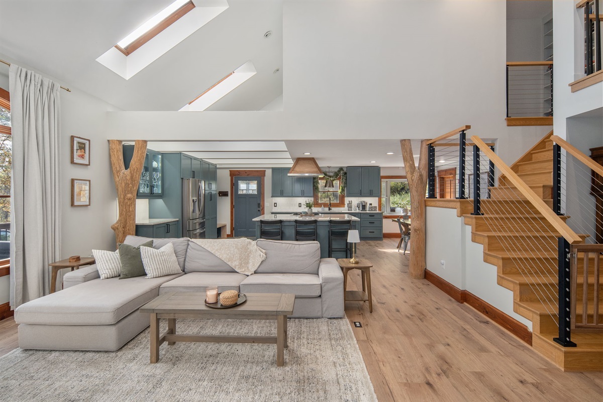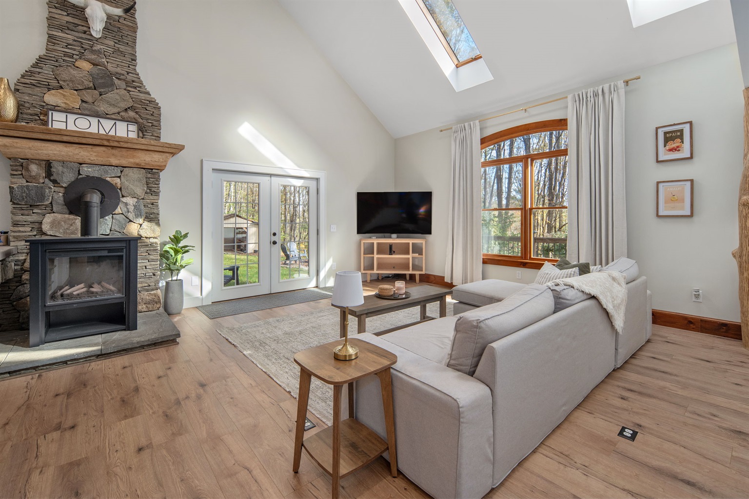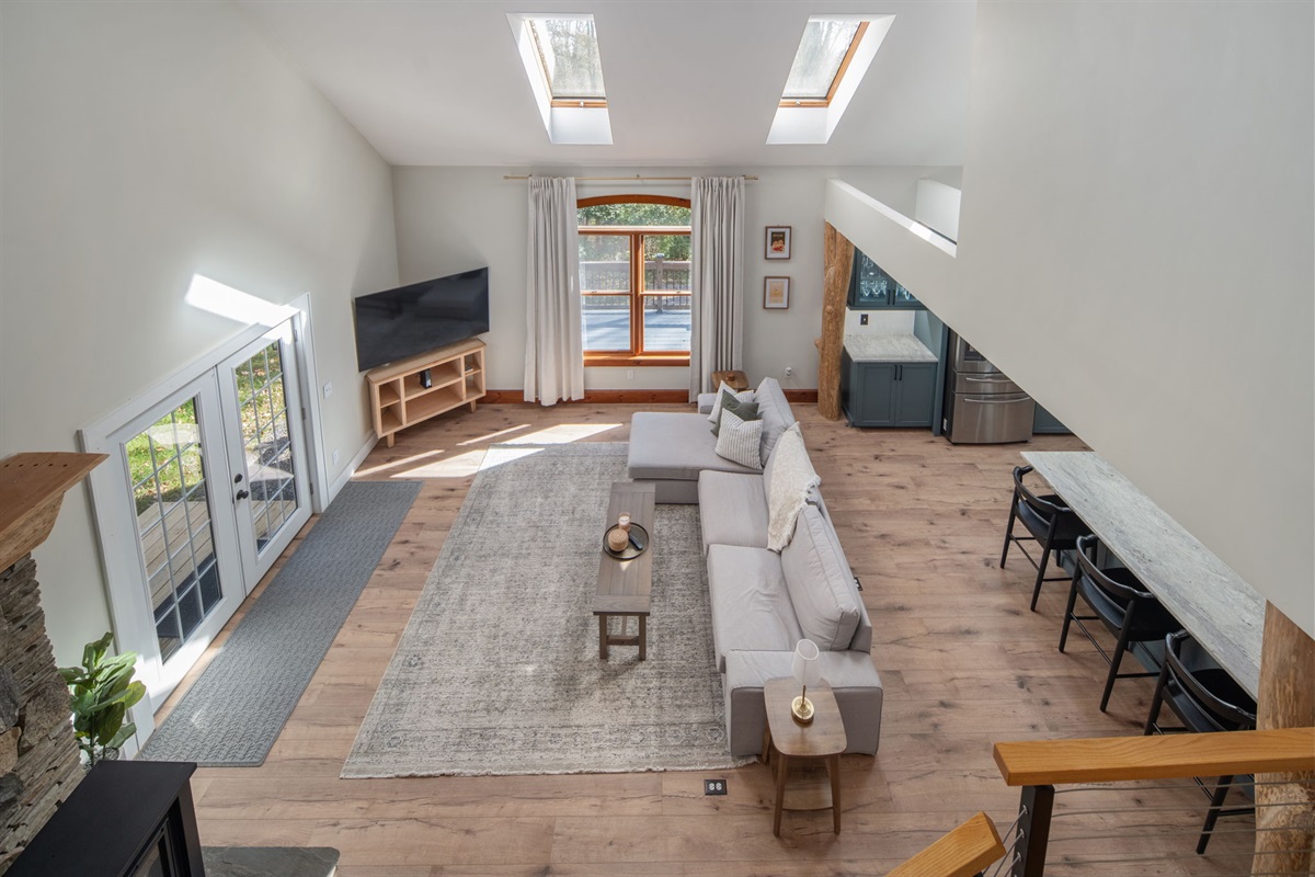 * Open-concept living area with vaulted ceilings, skylights, and a cozy electric fireplace.