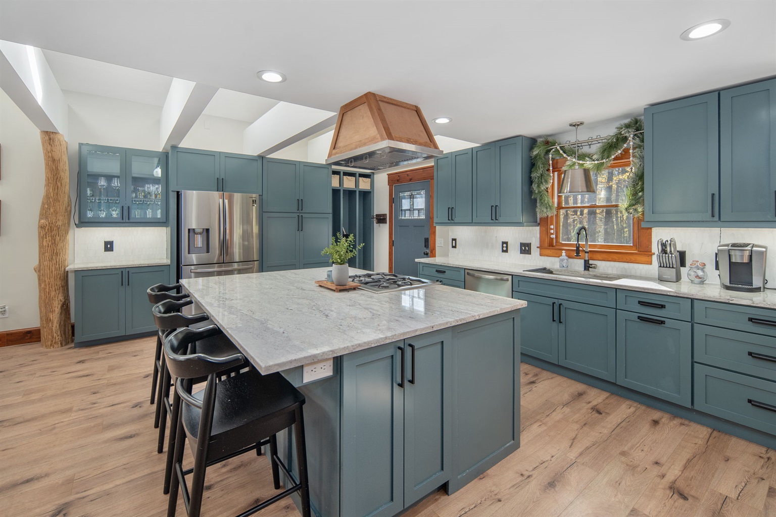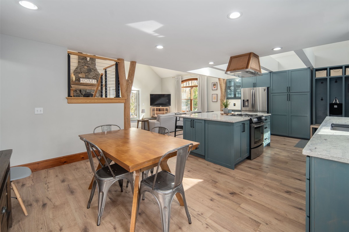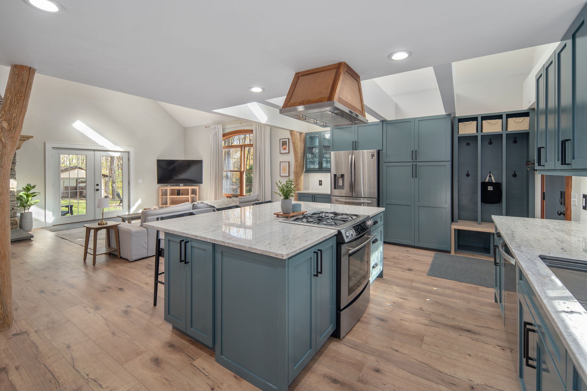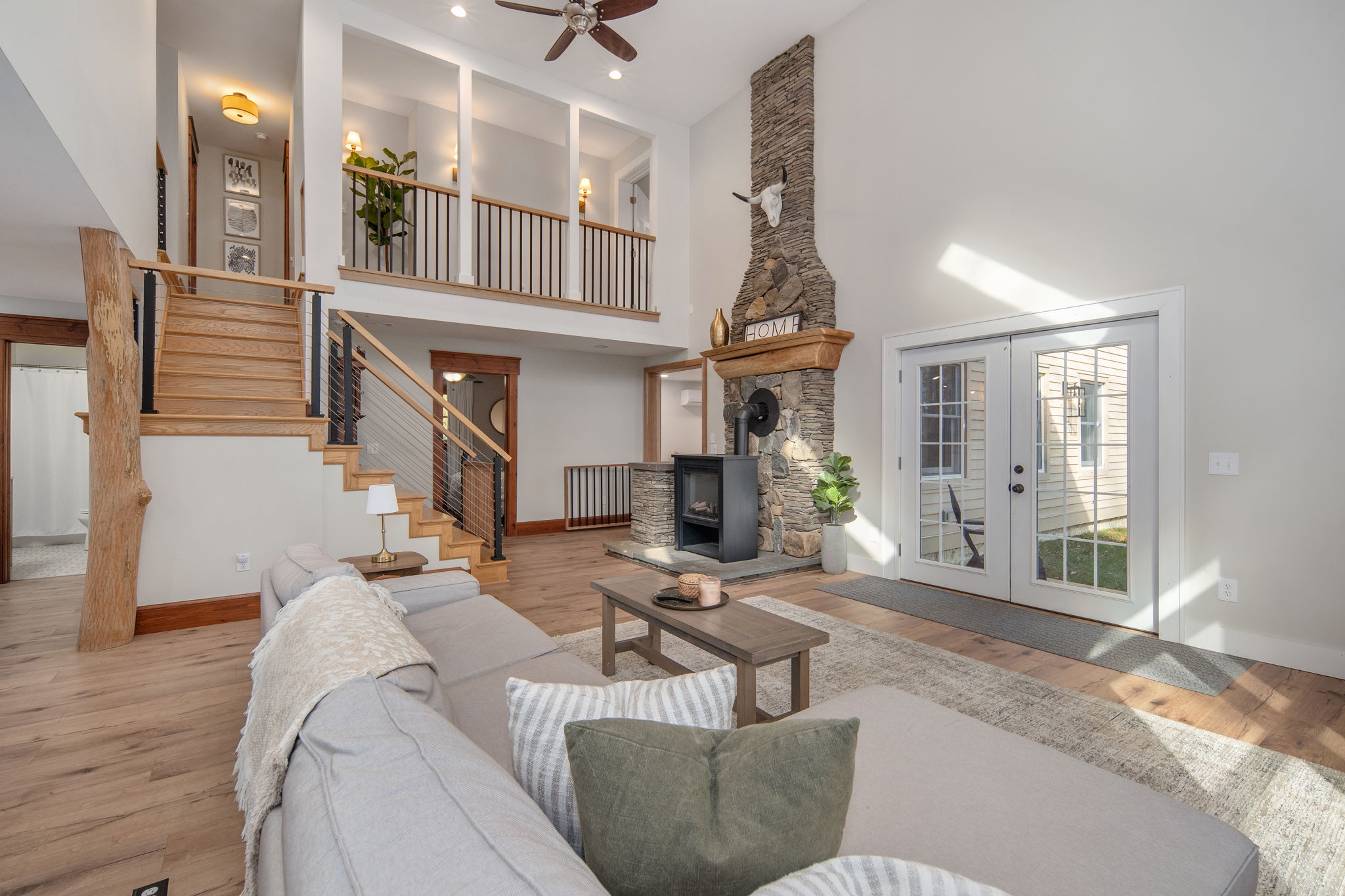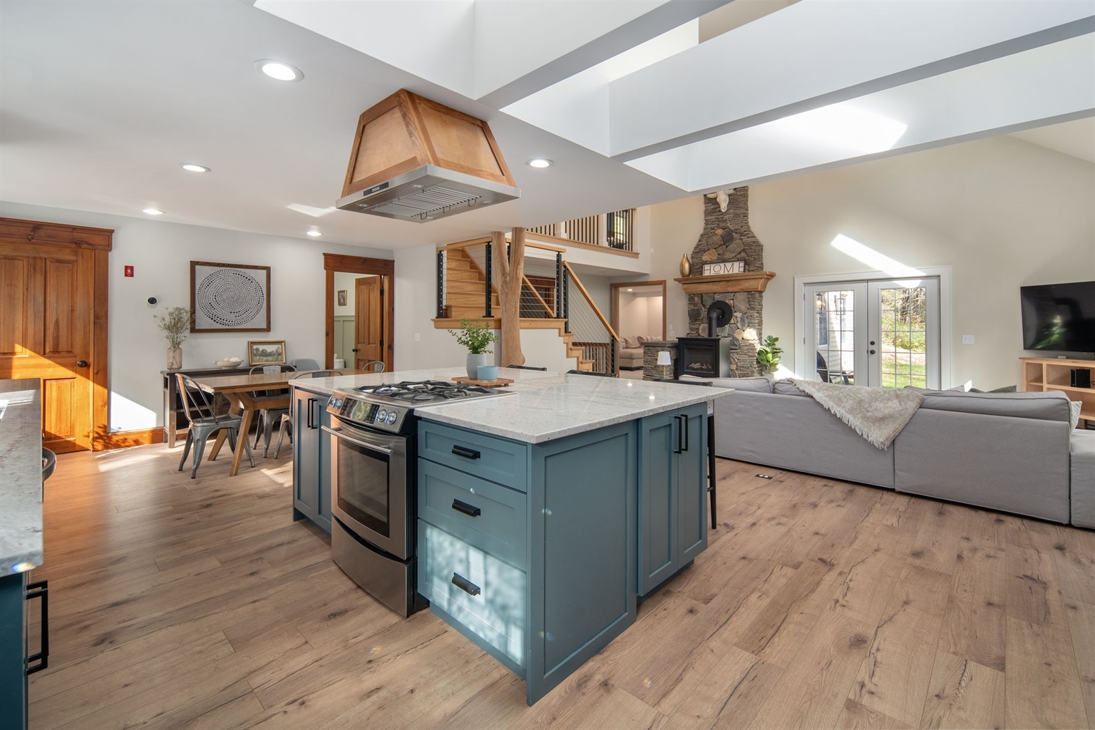 * Open-concept living area with vaulted ceilings, skylights, and a cozy electric fireplace.