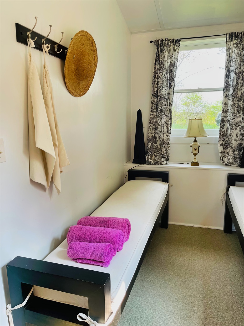 A full bathroom with a wide shower is located just off the main space, teak flooring gives off a spa-like feeling. As you enter the bathroom area there is a separate sitting area from the main space. A great space to relax and read a book.