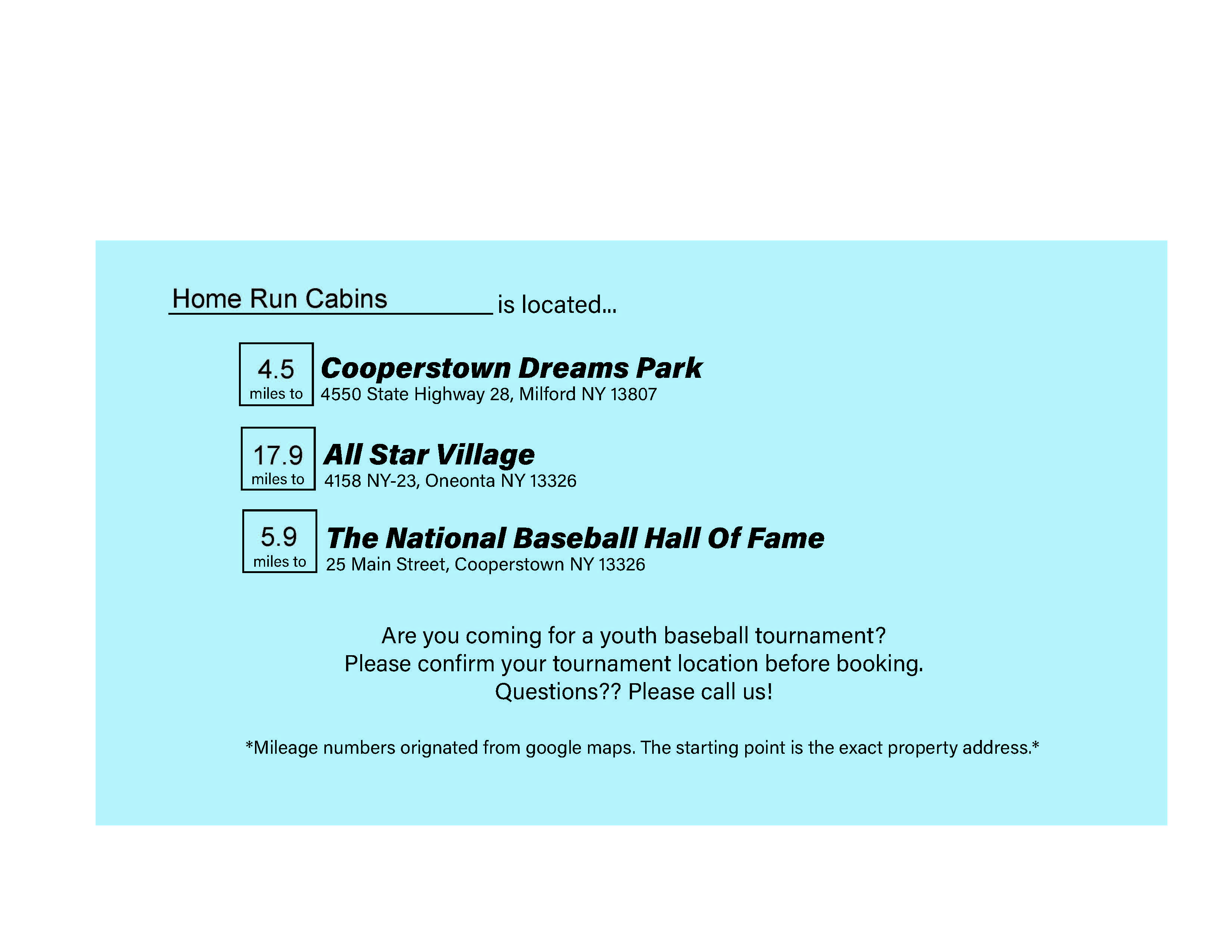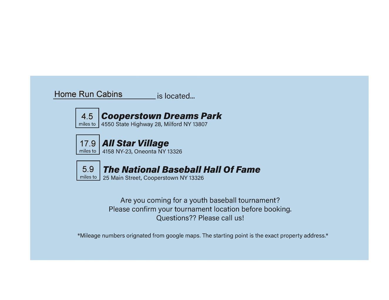 Home Run Cabins - #7 of 9 - Guests hit a HOME RUN with these delightful multiple private cabins set in quiet country setting nestled by a lightly wooded area. They are a perfect choice for multiple families who wish to be near each other and still have their own private lodging units. They are an 8 - 10 minute drive to the Cooperstown Dreams Park and the Village of Cooperstown w/ shops and restaurants.