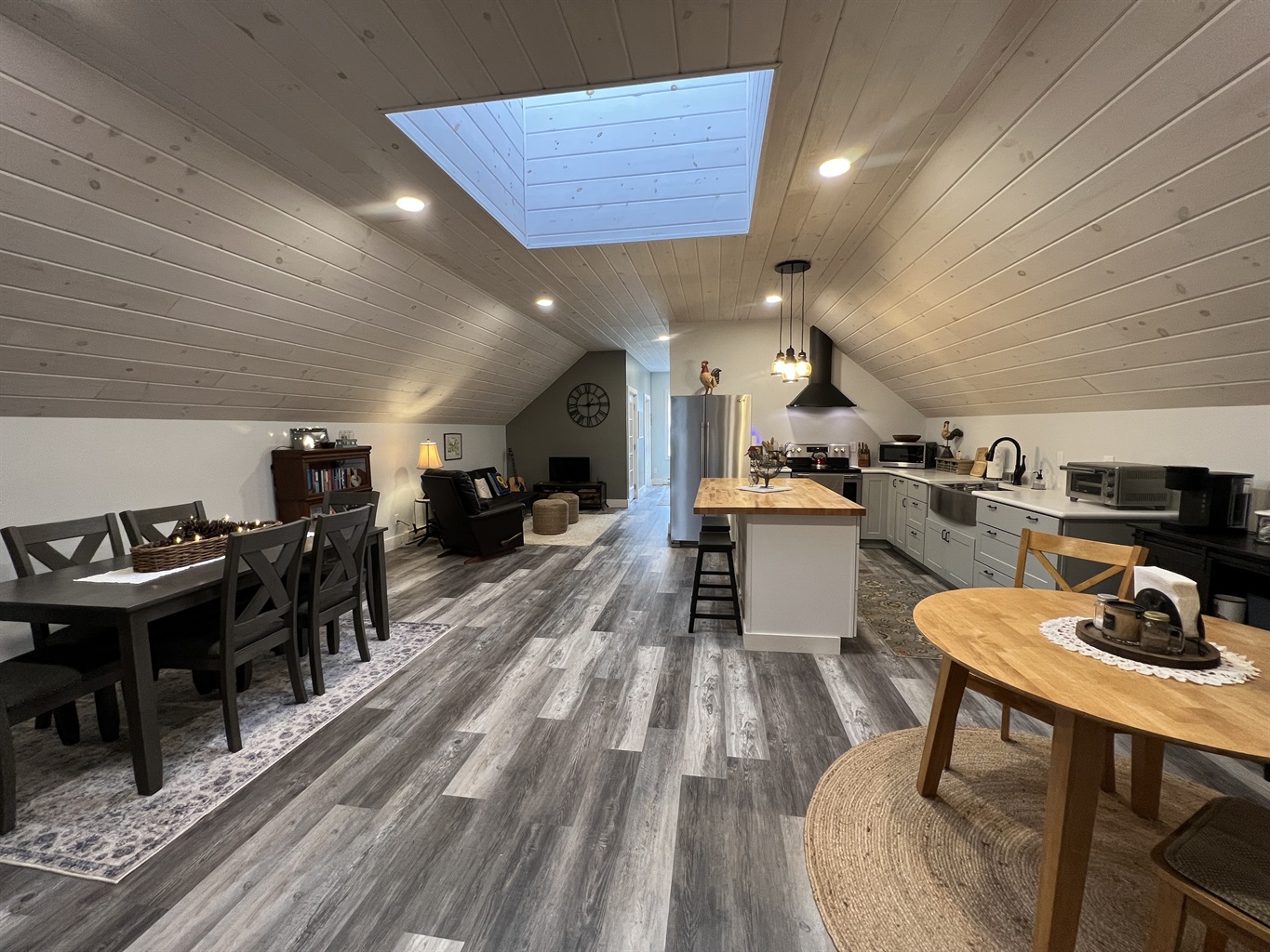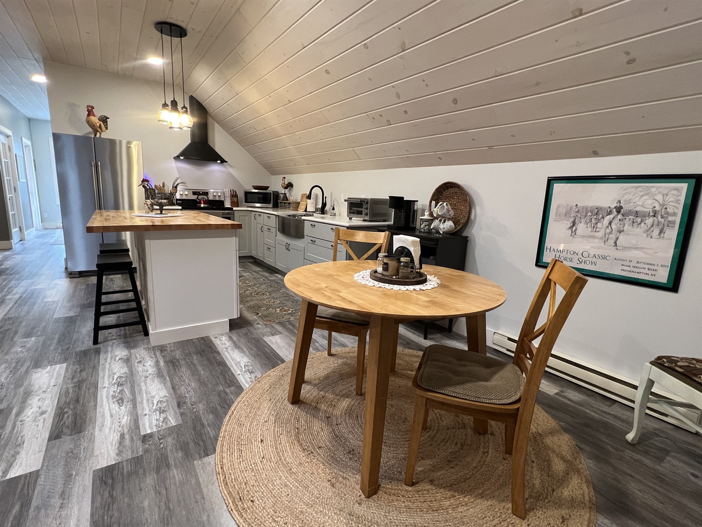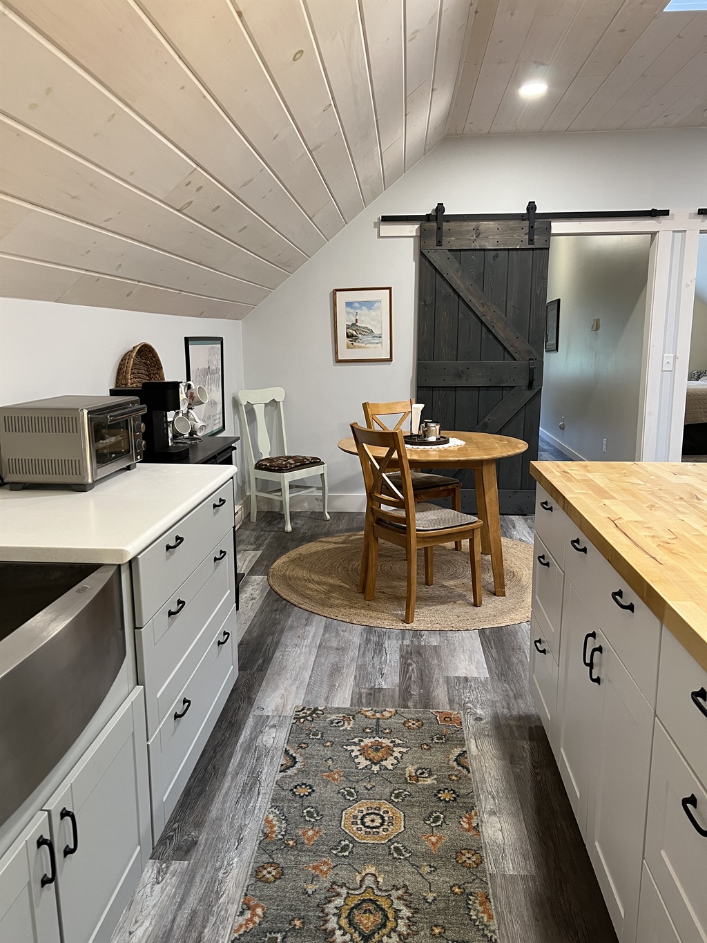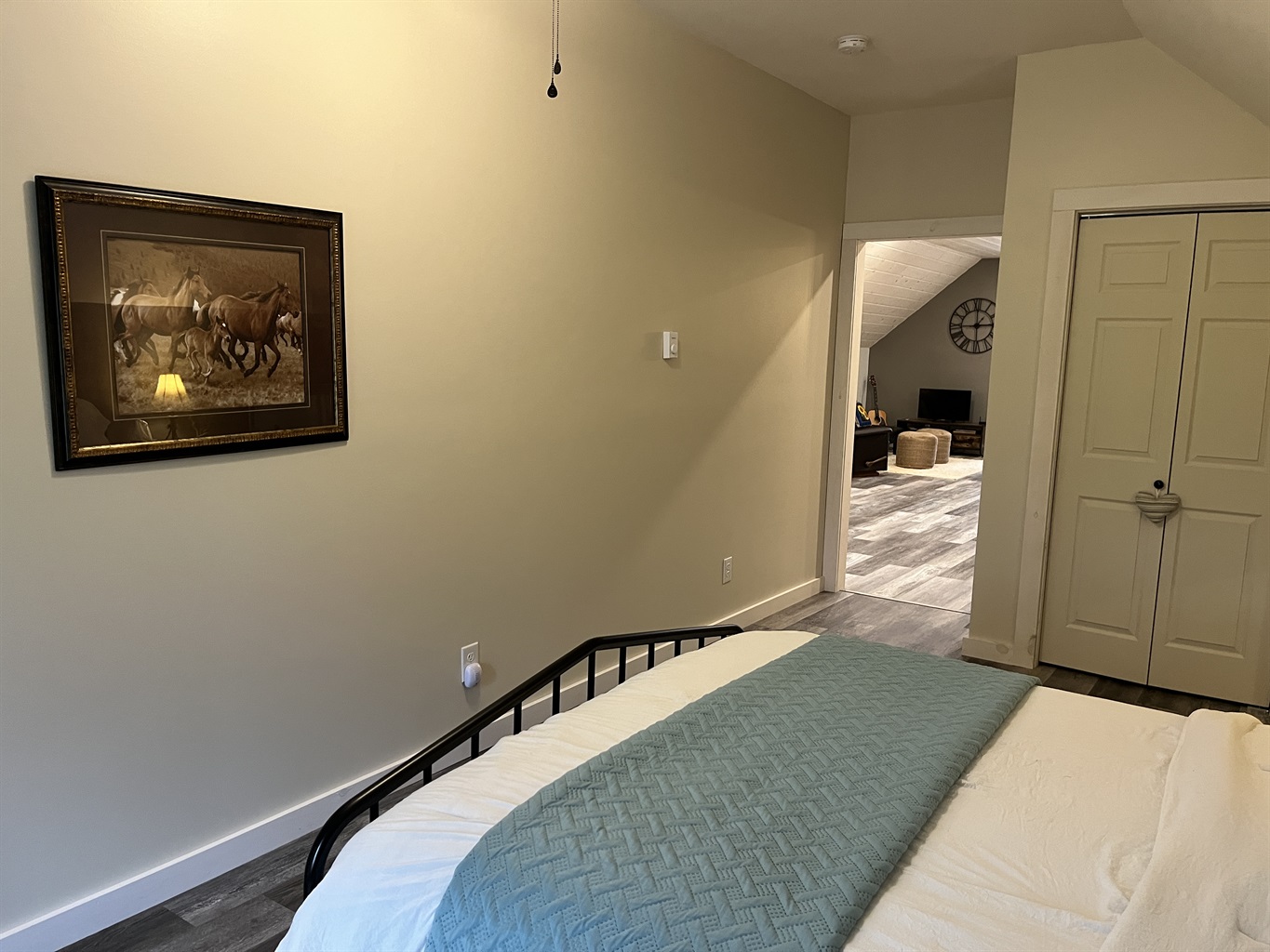 Horse Haven is a newly built 2nd-floor apartment located over the barn. The contemporary styling and open layout of this apartment make you feel right a home. All on one floor you have everything you need to enjoy your stay. There are 2 large bedrooms with queen beds. The main area enjoys an ideal open layout. The kitchen, living room, and dining room are all in one large open space making it easy to spend time together. There is a super cool cupola in the center of the room letting in lots of beautiful natural light. The bathroom is located in the hallway close to the main entrance. The bathroom is very spacious and spa-like with glass tile to the ceiling in the tub surround. There is a laundry room and pantry area just past the bathroom.