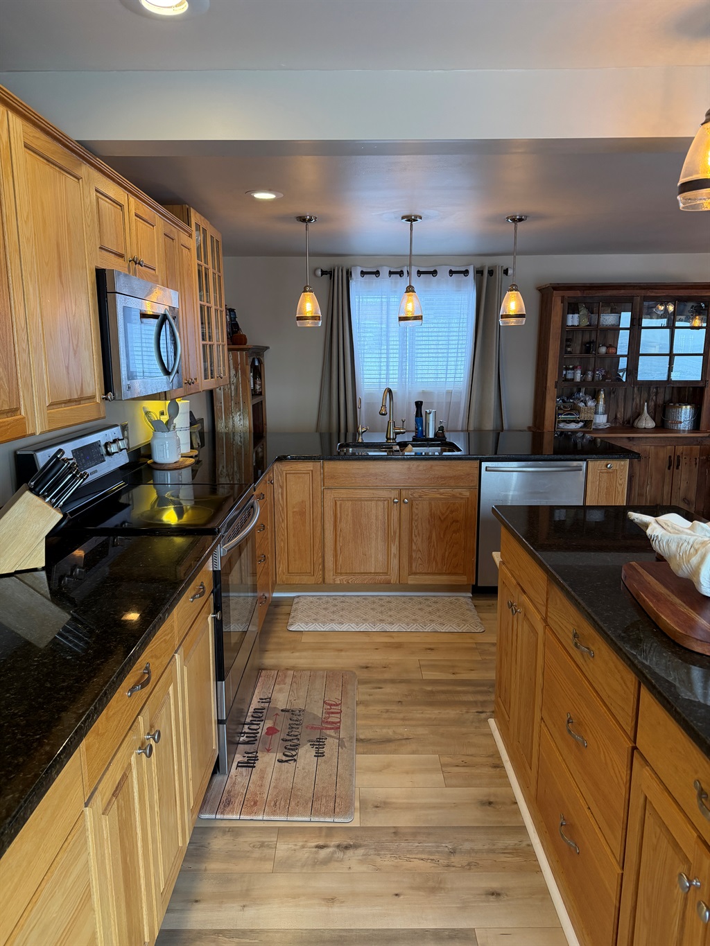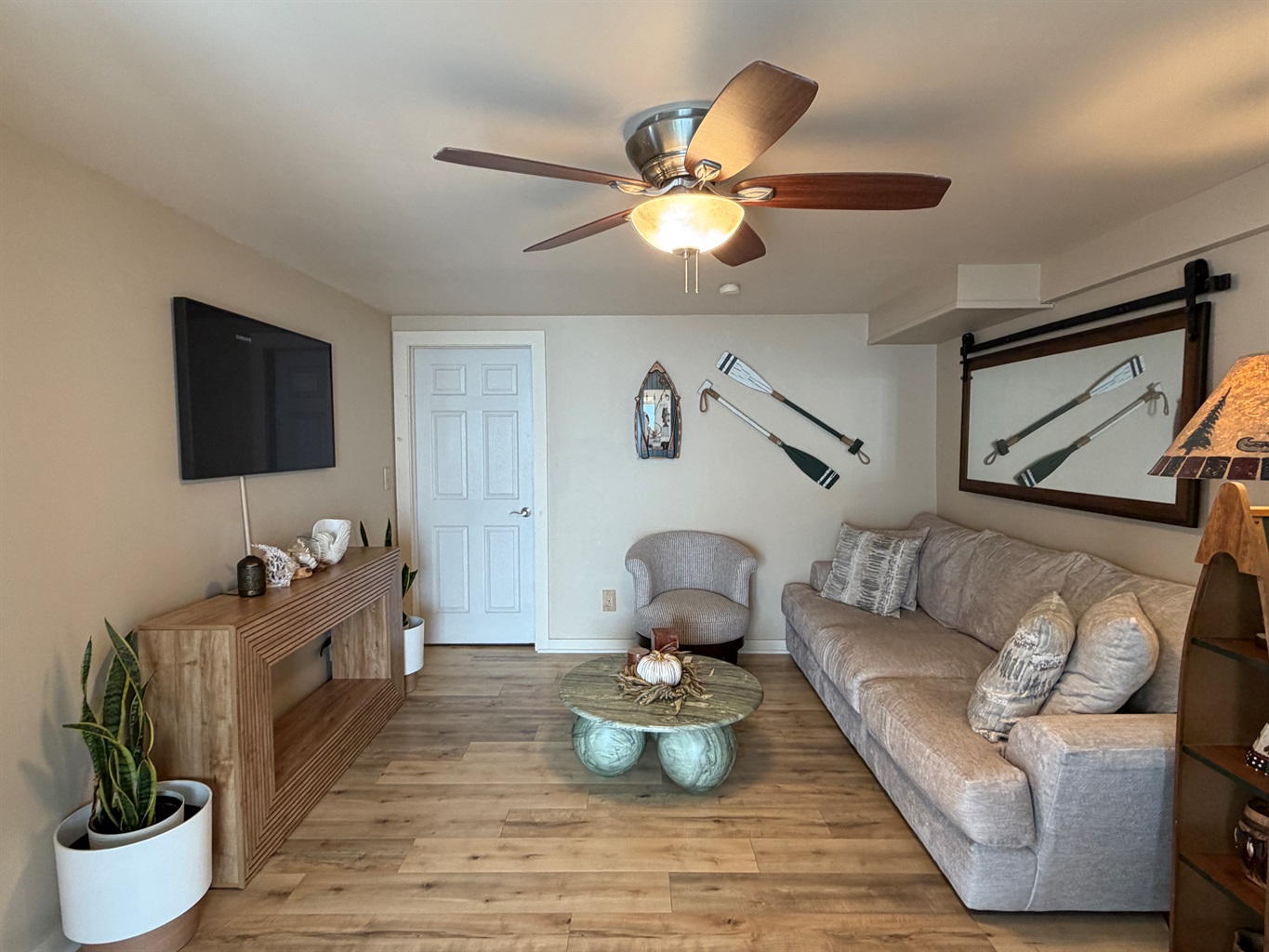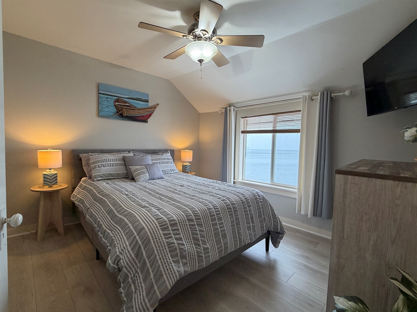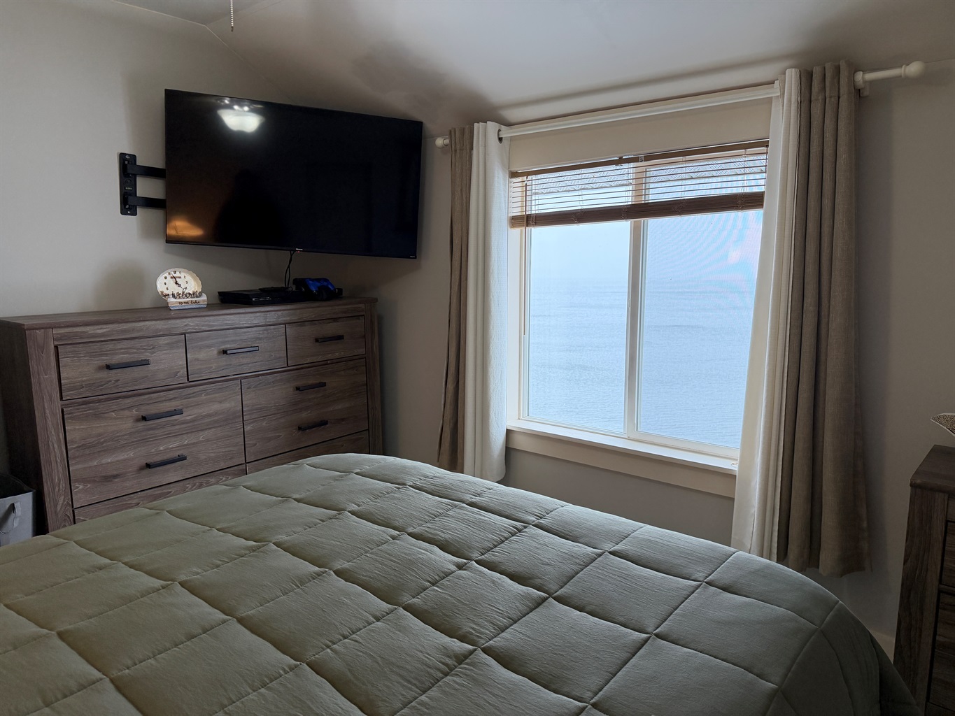 Inside, the home features a modern, fully updated kitchen with granite countertops, a spacious chef’s island, newer appliances, and a cozy breakfast bar for four—all with stunning lake views. The living spaces are warm, stylish, and thoughtfully designed with comfortable seating, charming décor, and Smart TVs throughout (including each bedroom).