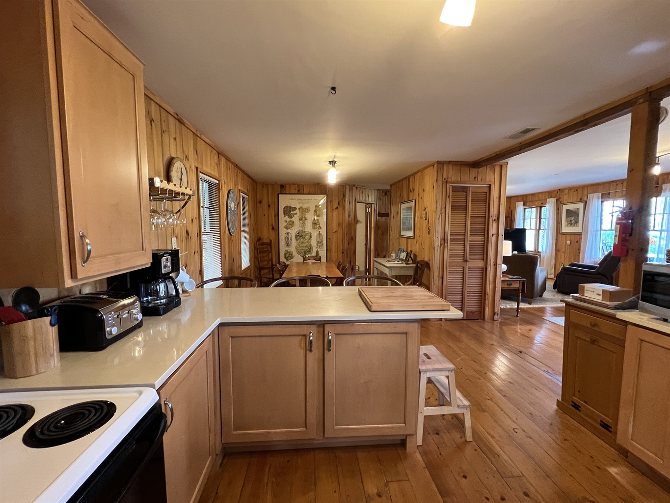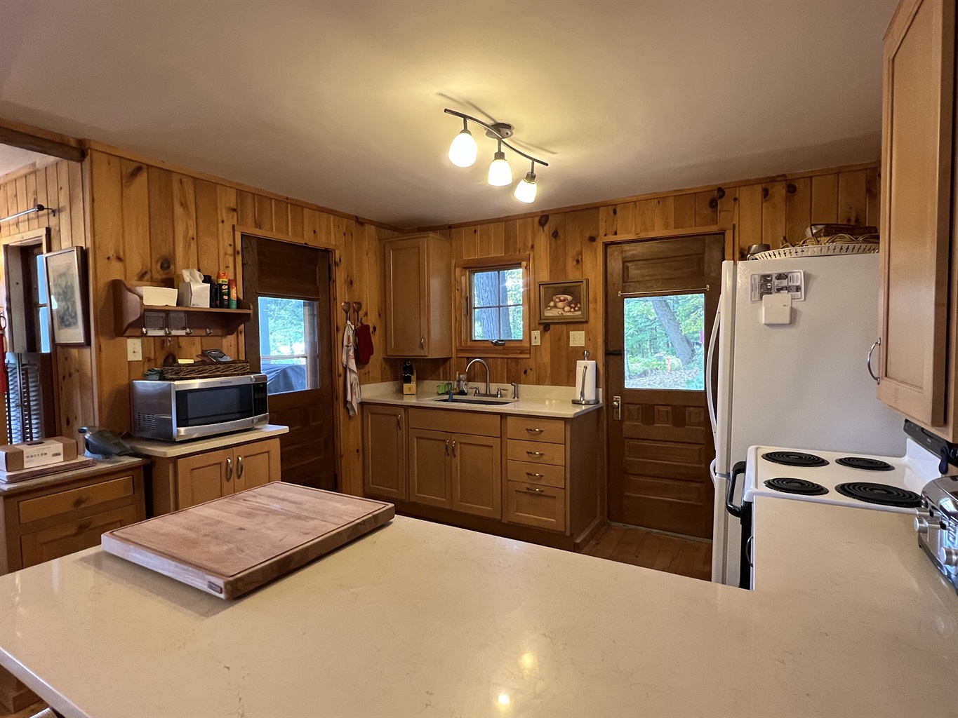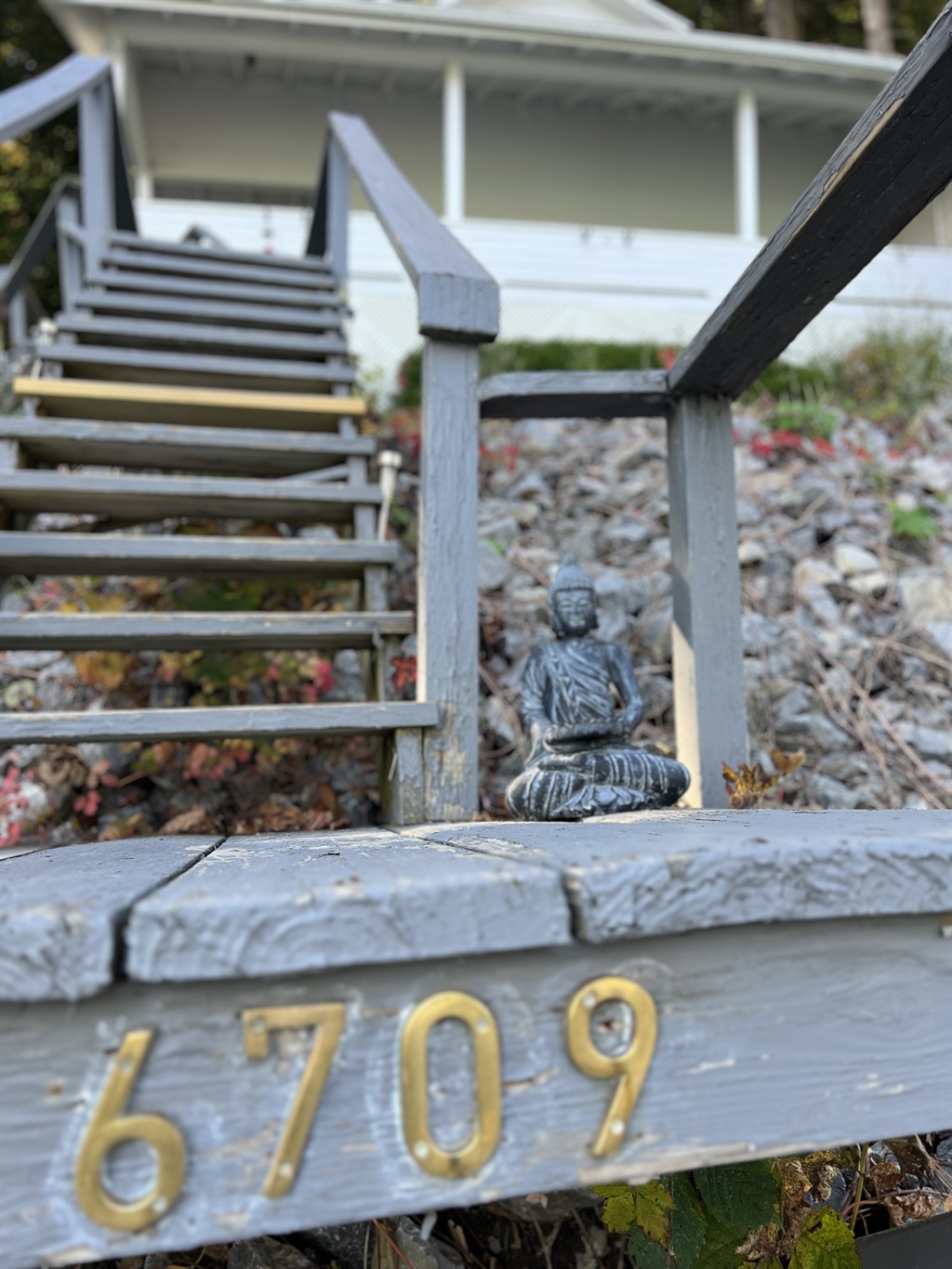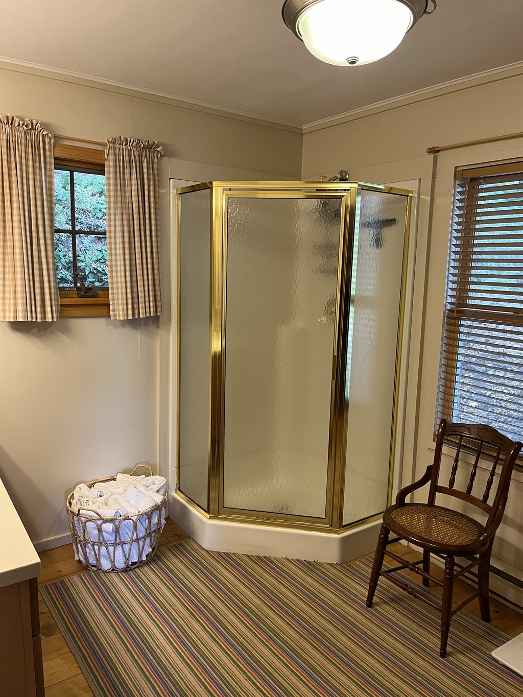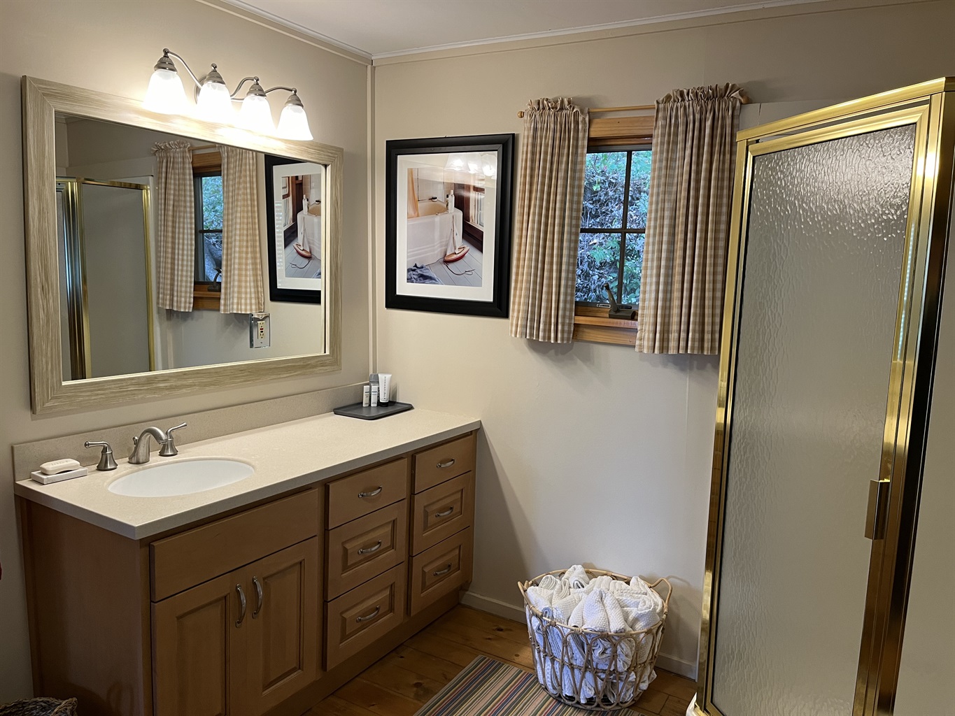 Up the stairs to the main house you will feel like you are above the trees, and the views get even better from the front porch. The front porch takes full advantage of the wide water views from end to end. Grill on the porch or step inside to the lovely fully equipped kitchen to prepare a meal. The 1st floor has a open layout including the kitchen, dining area, living room so one can see the lake as much a possible from the interior. A full bathroom with shower and washer/dryer unit complete the first floor.