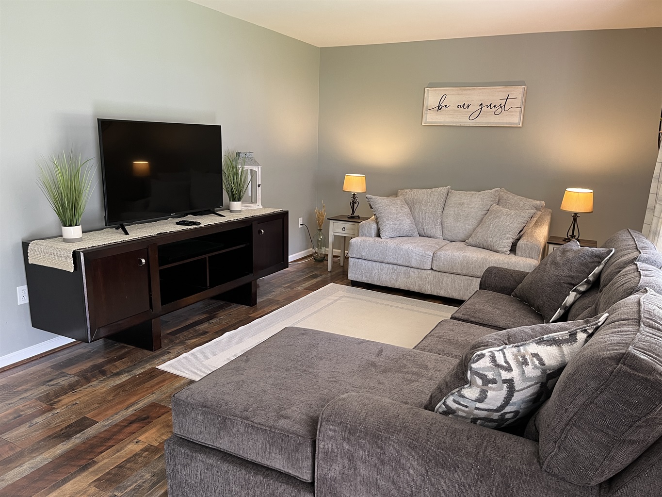 Don’t let the exterior fool you on this one, the home is very spacious inside! Enter into the main floor with the eat-in Kitchen overlooking the back yard, a large living room, 3 bedrooms and 2.5 baths all on one floor, no stairs necessary. The lower level has a 2nd living room great for the kiddos and 2 bedrooms. This home has been recently updated and redecorated to bring this classic into a new era, your host has thought of everything to make your stay as comfortable as possible. The layout is easy for groups or large families to spread out and still have a home like feel.