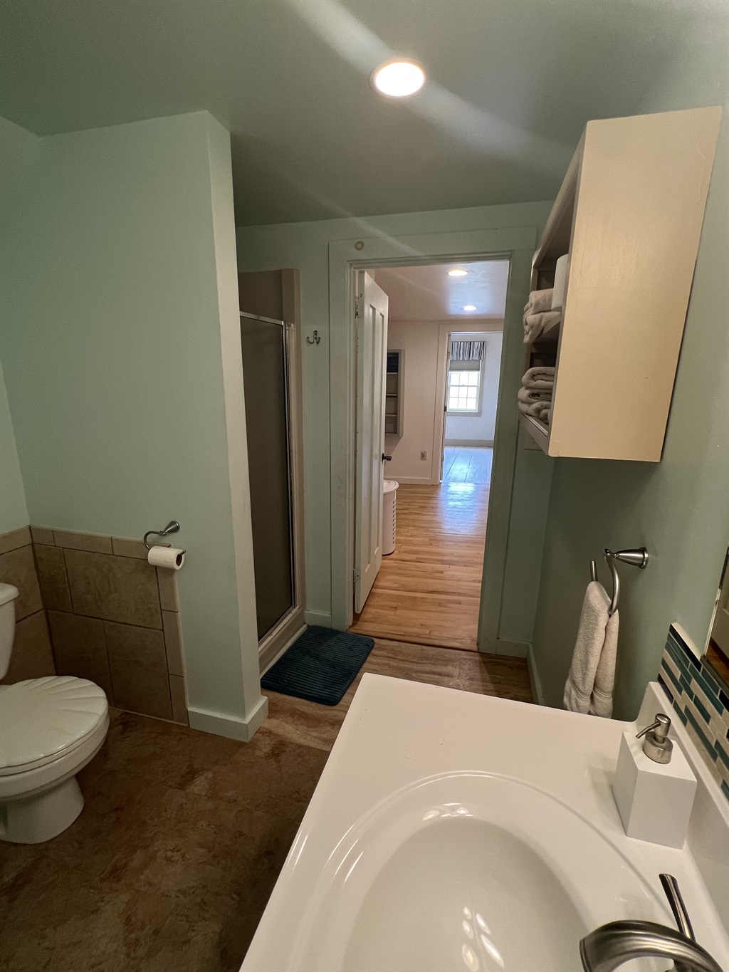 This 4200 square foot home has lots of separate common areas for dining and relaxing. There is an eat-in kitchen, a separate dining room, a large living room and the summer room. Your hosts have retained the hardwood floors throughout and have installed tile in the contemporary baths. Contemporary décor combines with vintage architectural features to create a welcoming and comfortable ambiance.