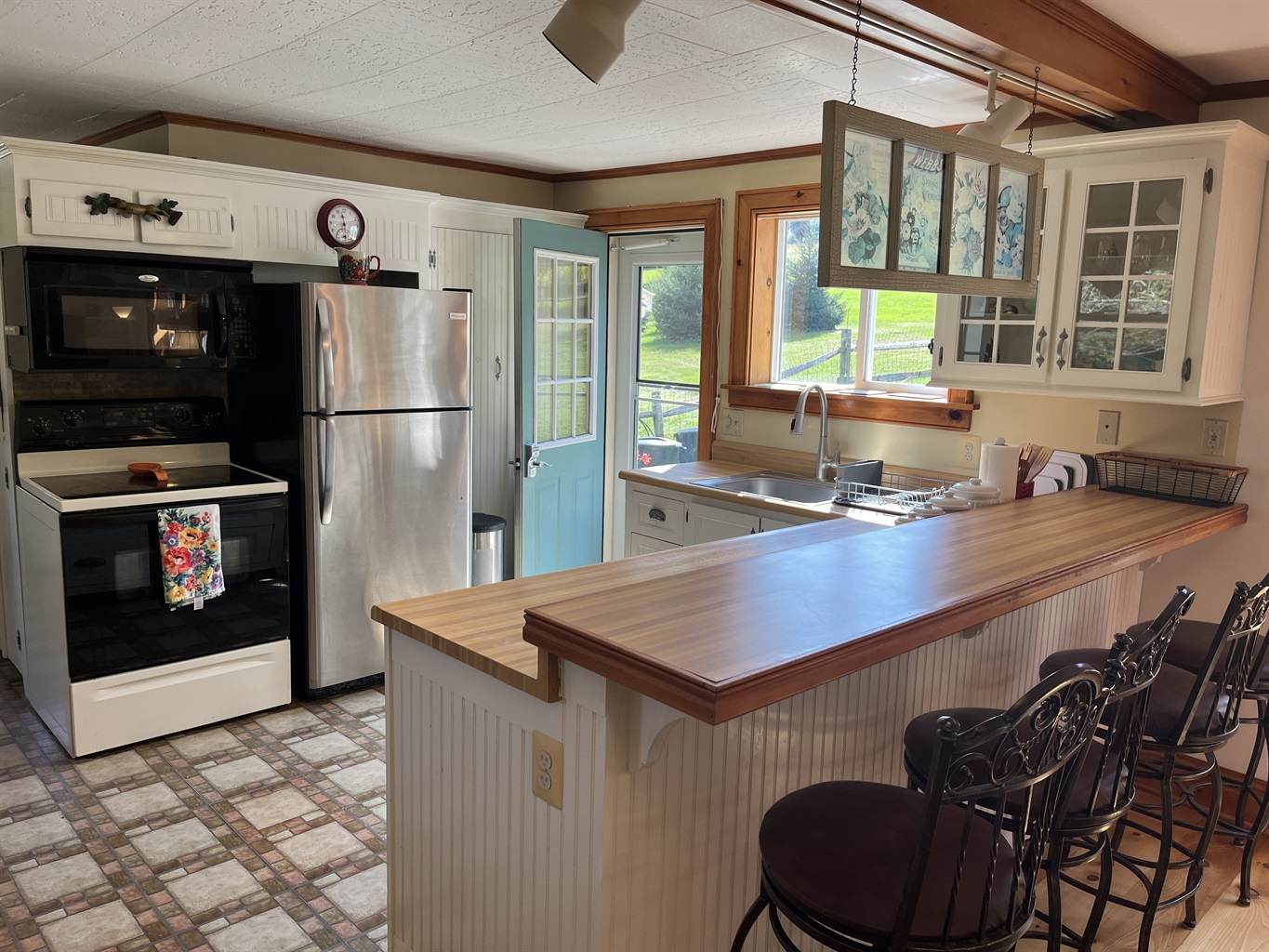 Pindar's Pond is located under 10 miles to All Star Village and close to all the shops and restaurants Oneonta has to offer. Set back from the road with lots of yard space its your own slice of the country side. The backyard has a large fenced in area great to keep kiddos close, sit on the stone patio and enjoy your morning coffee or an evening cocktail while the young ones play in the yard. Enter into the open kitchen with dining area and bar seating, the wonderful beadboard built in cabinets are a classic farmhouse touch. The kitchen is fully equipped with everything you need to make and serve a meal, just bring your own food!