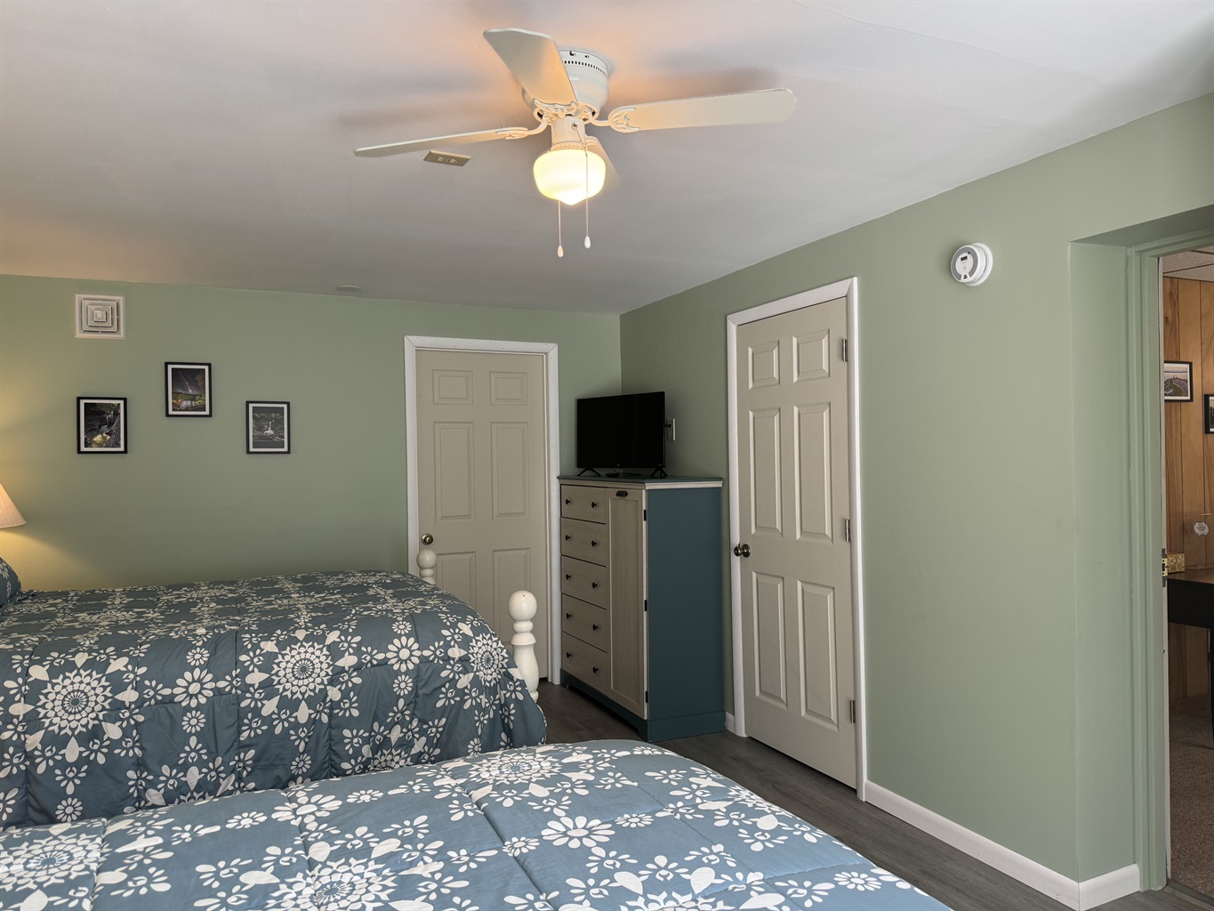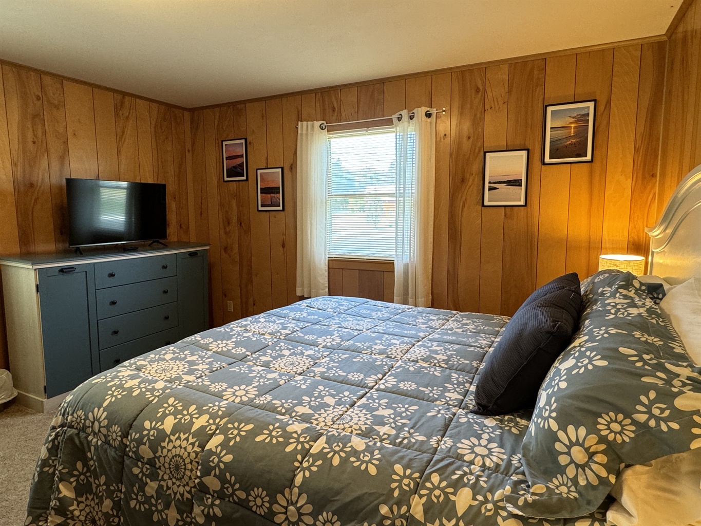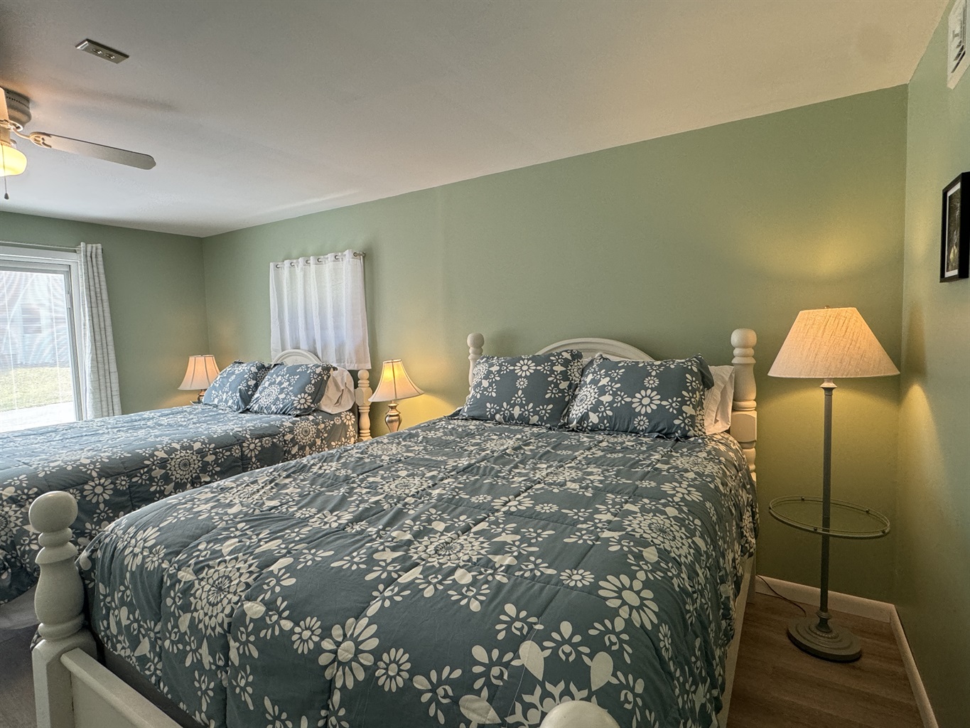 On the main level an open floor plan, living, dining, and kitchen area makes a great space to relax, cook, and dine together. The recent renovation features all new appliances in the kitchen, which is stocked with all the gadgets you'll need to cook for your group during your stay. If you'd rather take in the clear fresh air and eat outside, there is a rear deck just steps away from the kitchen. Stairs lead off the deck to a covered lower patio area as well as the backyard. There is a renovated full bath off the hallway as well as a King bedroom with laundry within on the Main level. The lower level can be accessed by the stairs inside or you can enter from the ground level at the rear of the home. The lower level has a 2nd living room, a full bath with shower, another laundry area, a bedroom with 2 double beds, and a bedroom with 2 queens. The 2 queen bedroom has its own private entrance with glass sliding doors which lets in tons of natural light.