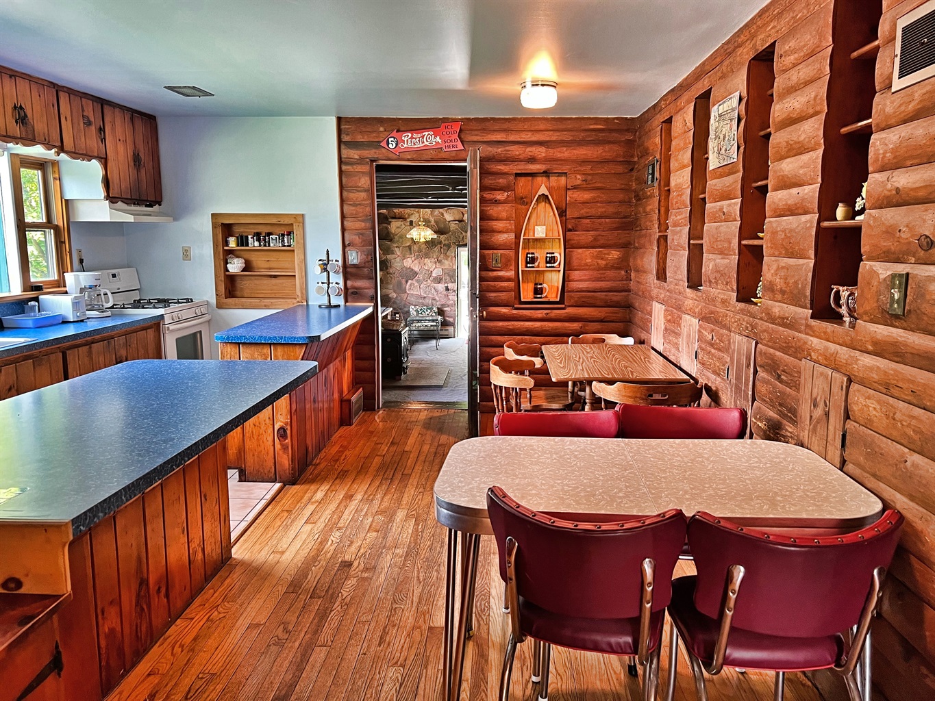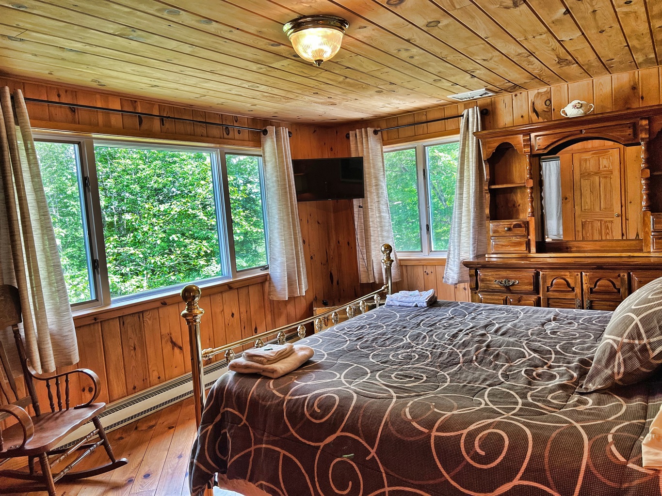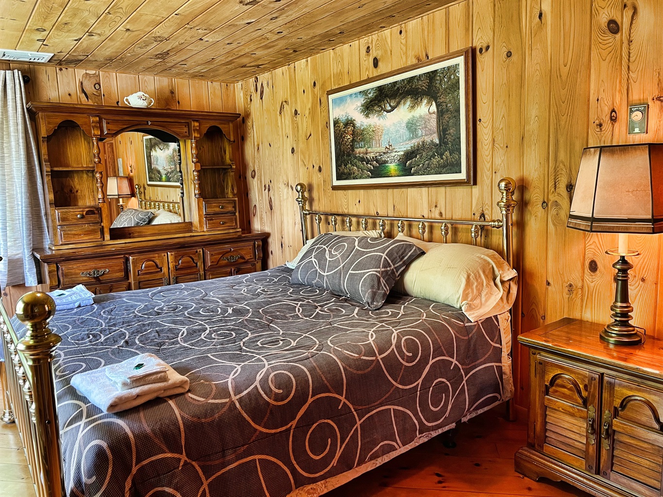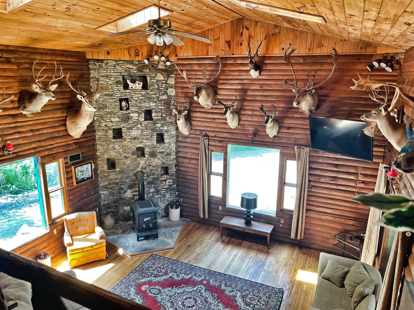 This 4500 square foot vacation home has a spacious living room with cathedral ceilings and lots of natural light. The living room showcases the owner’s private collection of wild game trophies, taken from all over North America, the owner is an avid outdoorsman. Stolk's lodge also has a large great room, complete with comfortable seating, a dining area and a foosball table for family fun. Sliding glass doors lead to a patio with a view of the 5-acre pond. Breathe in the fresh country air as you enjoy outside dining on the patio. A gas grill is provided for outdoor cooking.