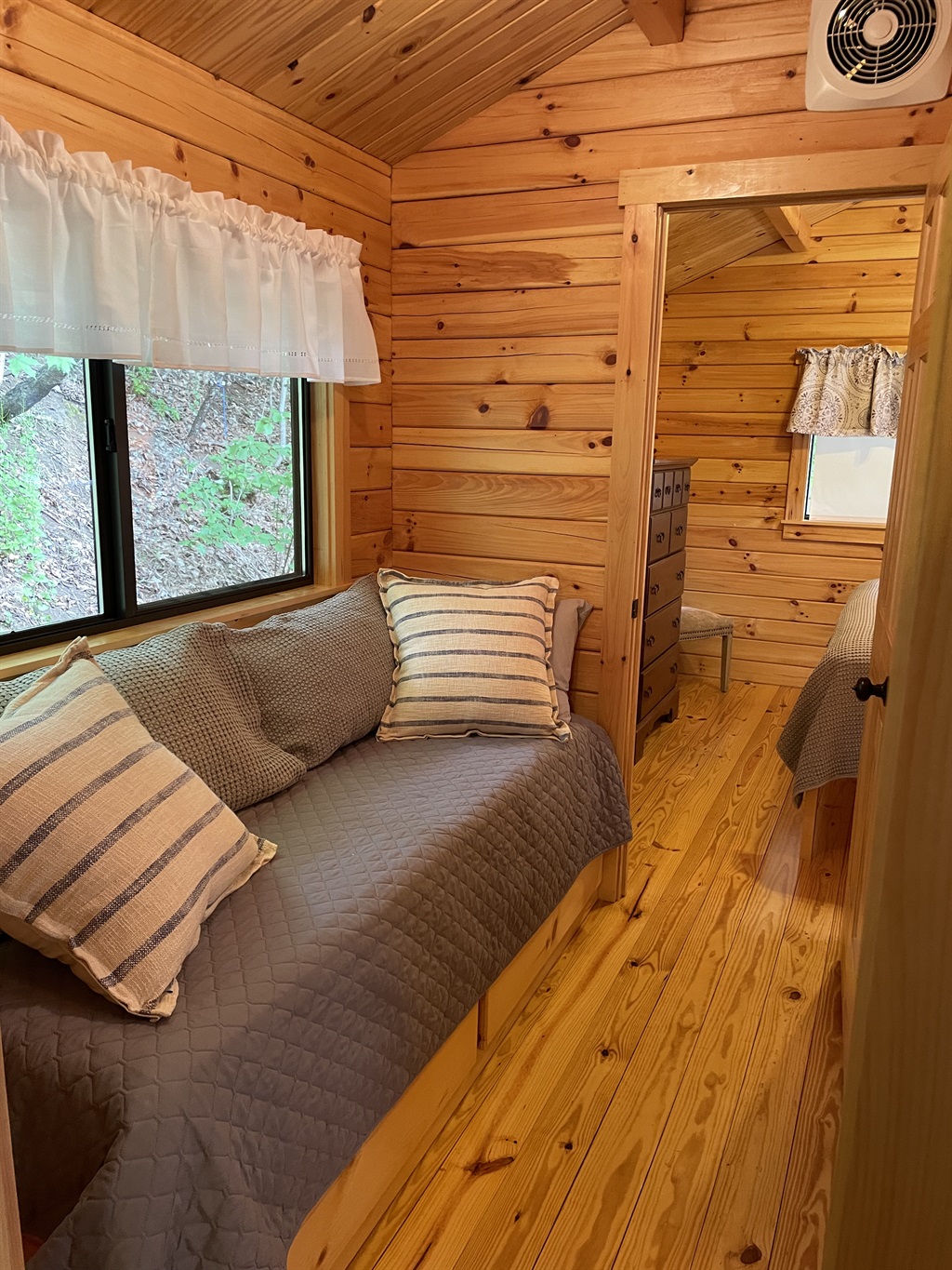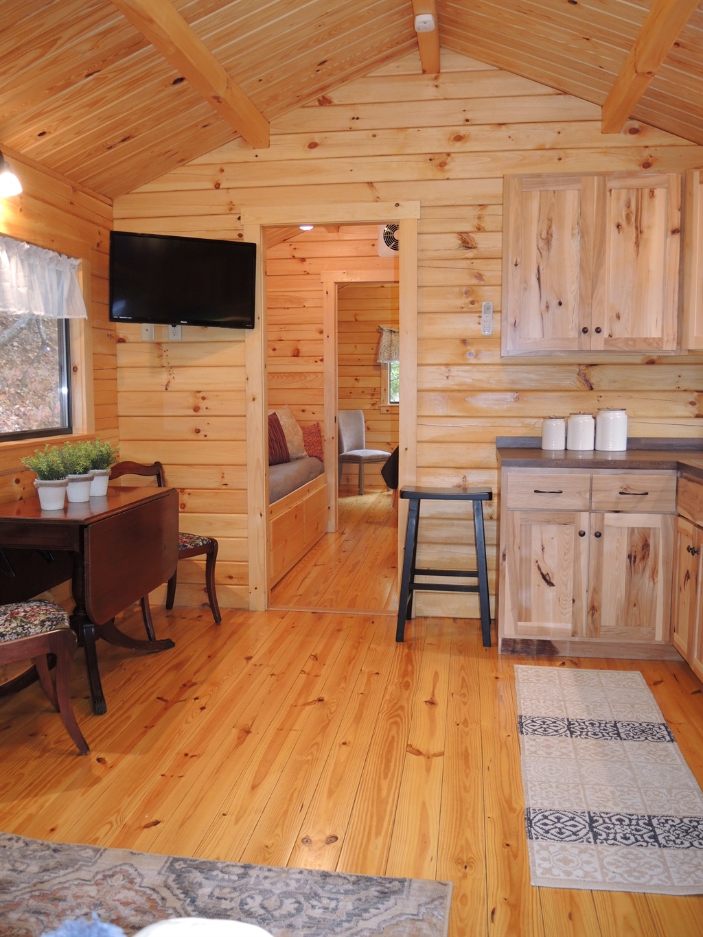 Terrace Lawn Cabin is new construction in 2019 and has the perfect new cabin feel. With beautiful pine wood used throughout, you get the mix of cozy cabin and proximity all in one stop. This cabin has just what a discerning traveler needs for a great week away. There is a screened-in porch with outdoor seating. The bedroom has a king bed, and there is a built in twin bed in the hallway.