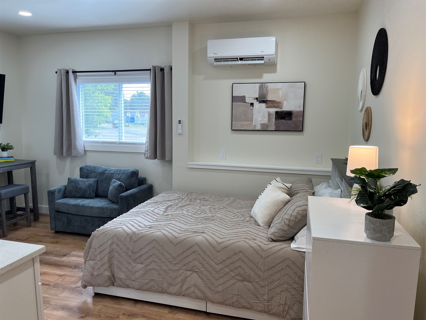 Each unit has a full kitchen, with a refrigerator/freezer, 4-burner electric range/oven, microwave and dishwasher. Each studio has a Queen sized bed and a SmartTV in the living area. Studio 4 has an additional twin-sized pull-out sofa. There is a full bathroom with a tub/shower. Wall-mounted mini-splits provide both cool/heat for each studio. Your space had its own temperature control.