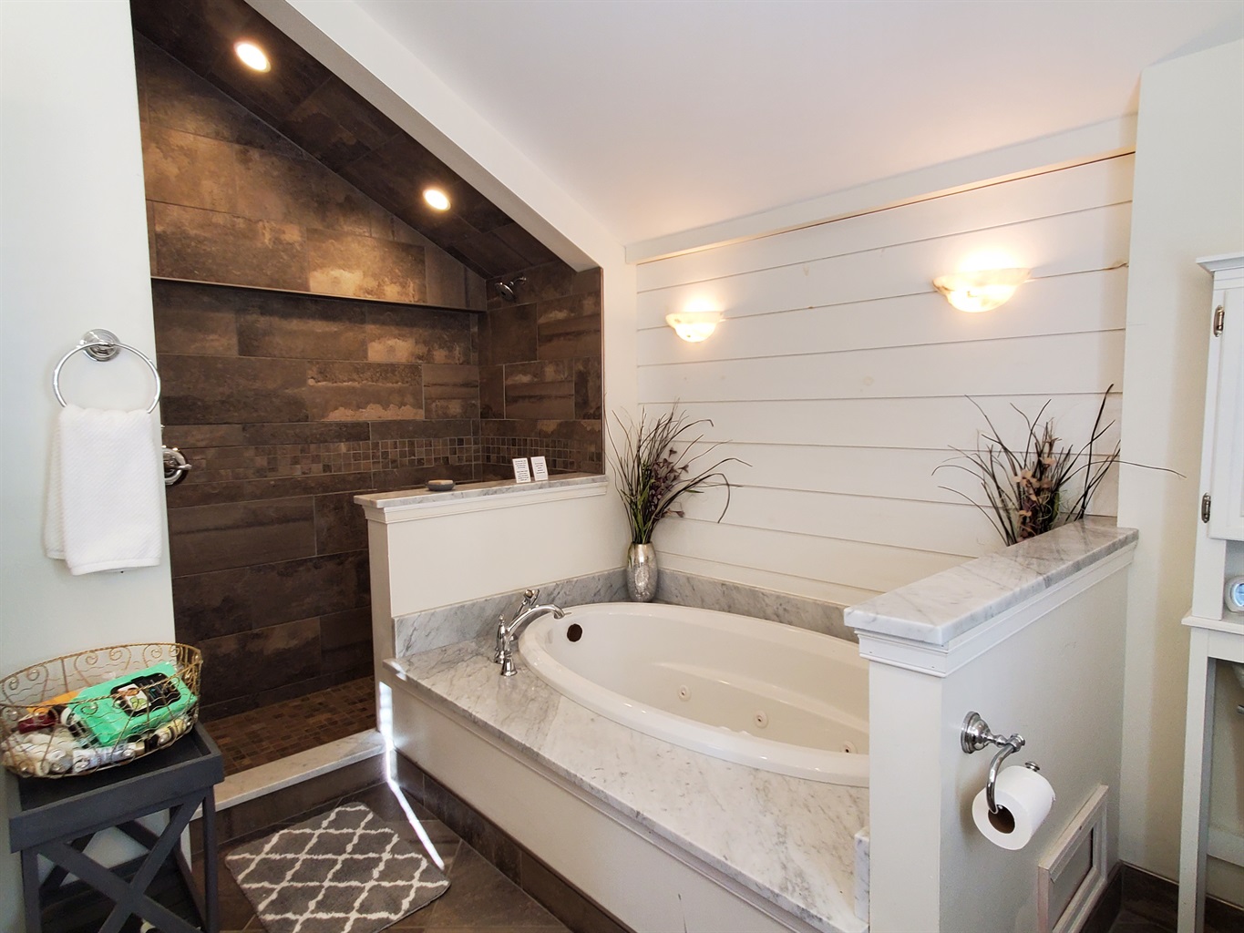 On the 2nd floor, you will find all the bedrooms and a half bath off the landing area at the head of the stairs. A spacious King bedroom with a luxurious ensuite bath makes the primary bedroom a very desirable spot. A wall-mounted TV and wall-mounted electric fireplace make for a great place to rest and relax. In the ensuite bath, you will find a custom tile walk-in shower as well as a separate large jetted tub for soaking and more relaxation. Additionally, on the 2nd floor, there is a beautiful Queen bedroom and a room with 2 twin beds. Each bedroom has its own Smart TV.